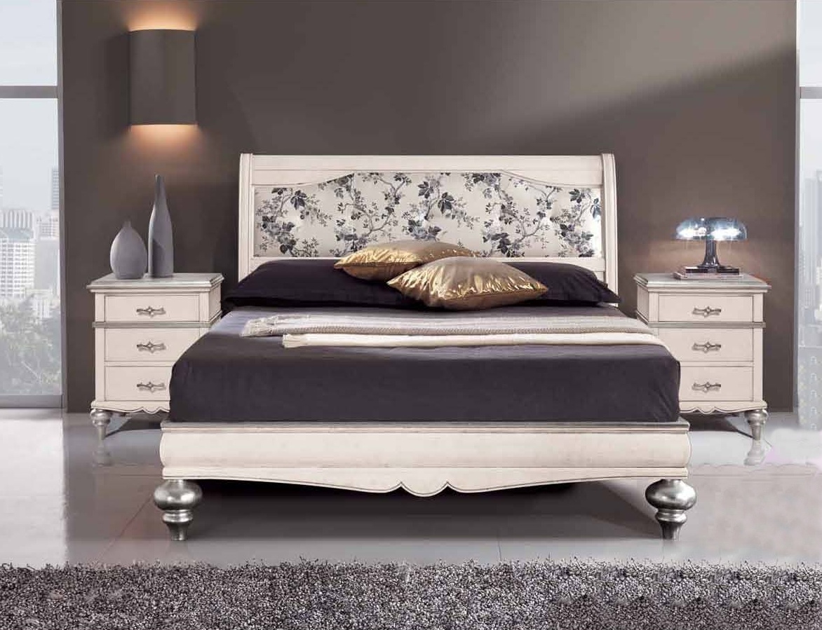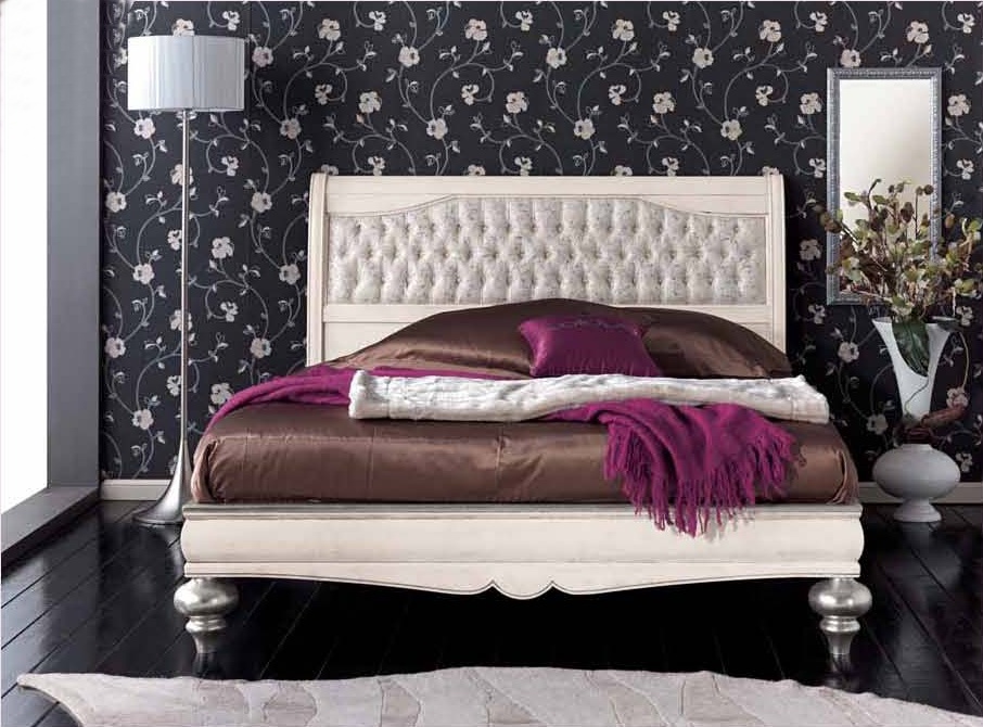 Double bed from Italian manufacturer Mirandola Export. The bed has a wooden frame. High headboard upholstered with textile. There is a variant of execution of the headboard with a Capiton? finish. The product is covered with white and silver lacquer. Elegant shaped legs, padded headboard make the bed Mirandola Export the ideal option for Your bedroom.