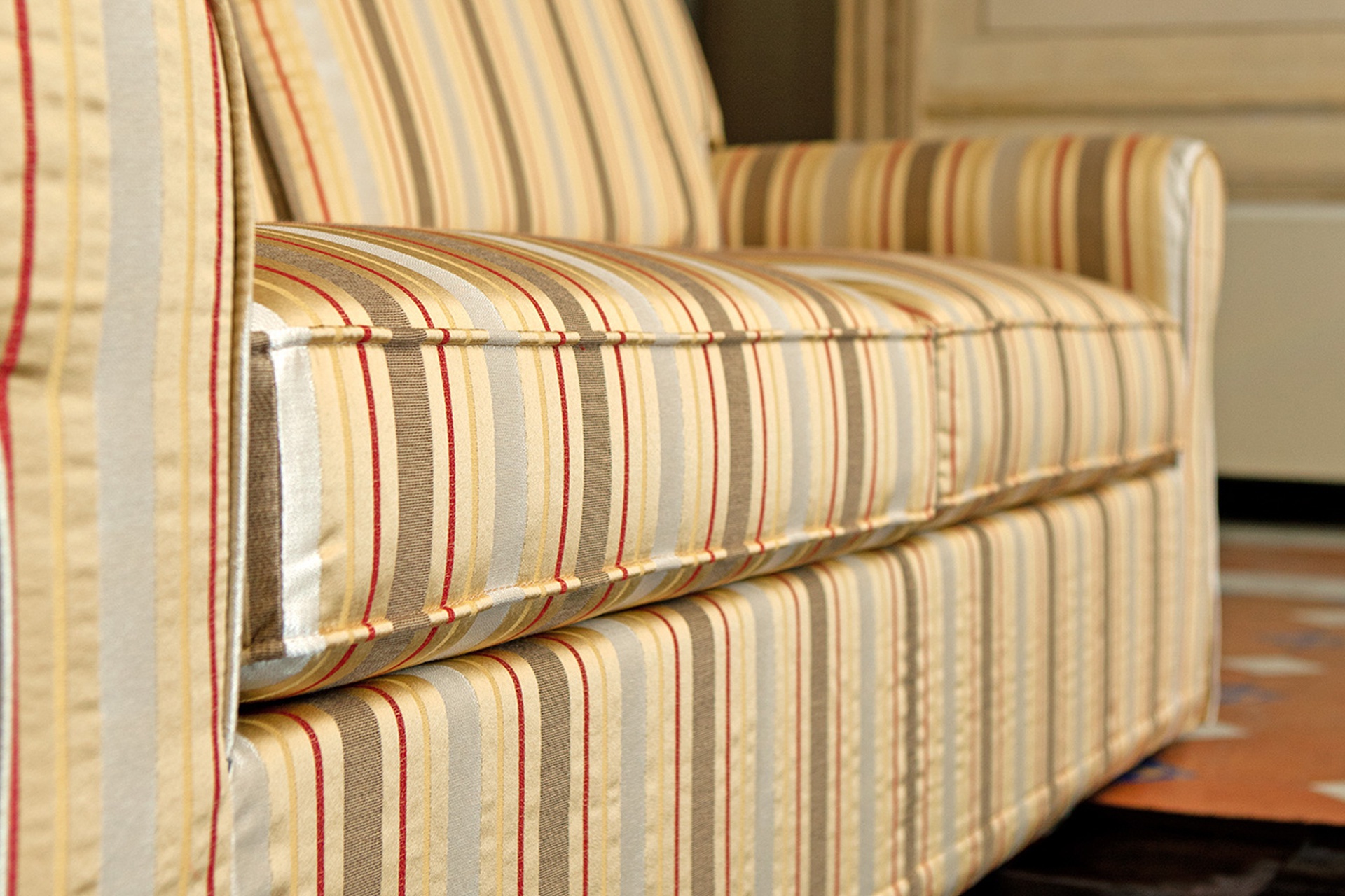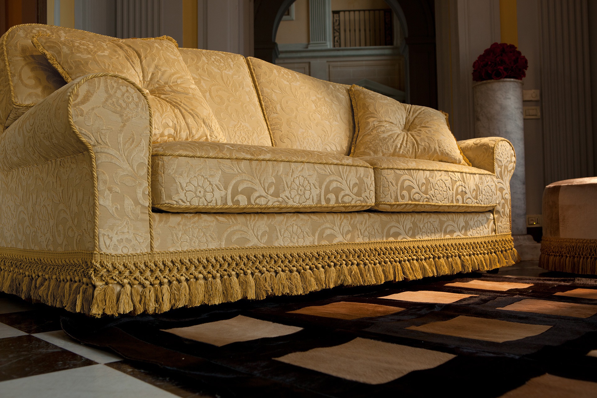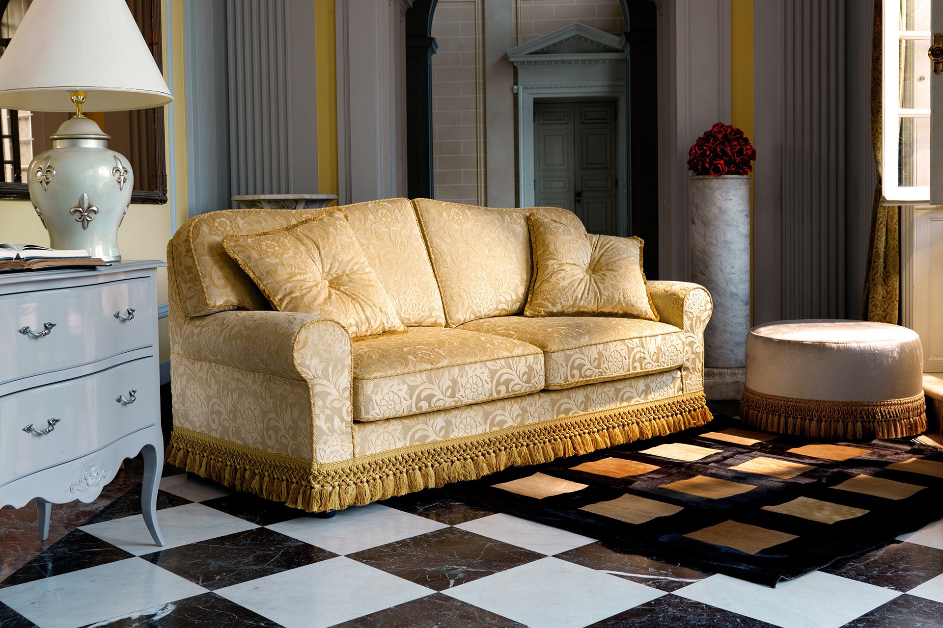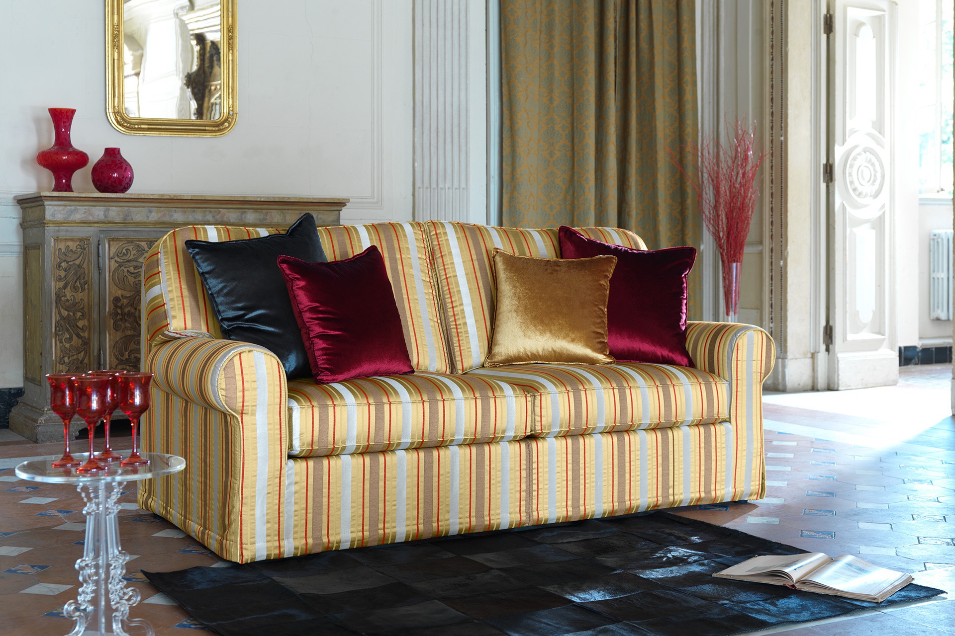 The Enea sofa collection Home from the Italian manufacturer Domingo Salotti. Sofa classic proportions with a completely hidden frame will decorate the living room or boudoir. Made in the style Neoclassicism. Available double and triple models. Sofa, fully removable, can be used as a bed. Material - composite wood, frame solid wood, poplar or fir. Welded steel mesh in 2 addition, the filler - polyurethane foam of different densities, Dacron. Mattress height 12 cm in the case of cotton canvas. Upholstery textile with a pattern or stripe. Back braces, armrests upholstered round; available model trimmed with edging and fringe. Complement a set of decorative pillows. Colors to choose from a collection company.