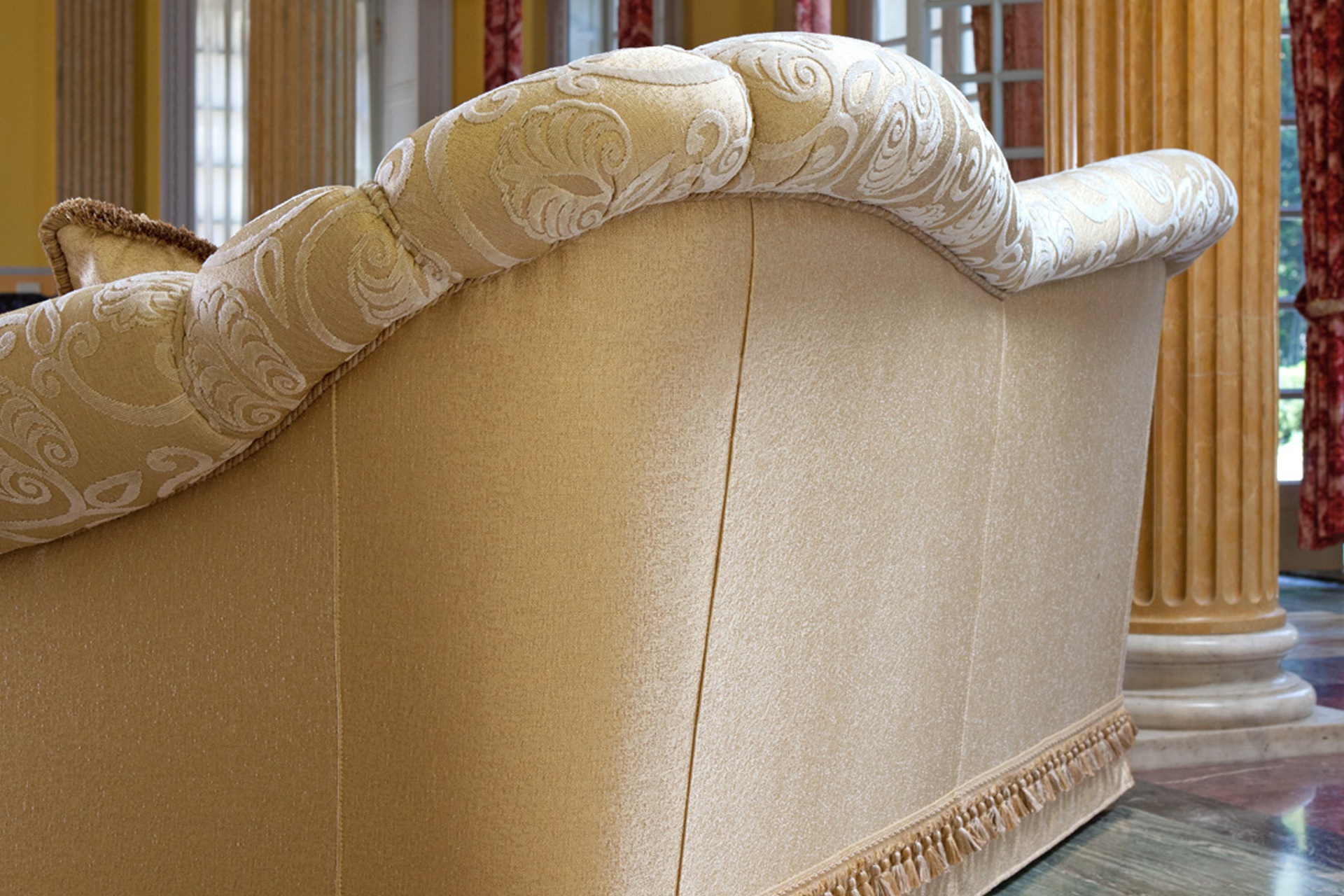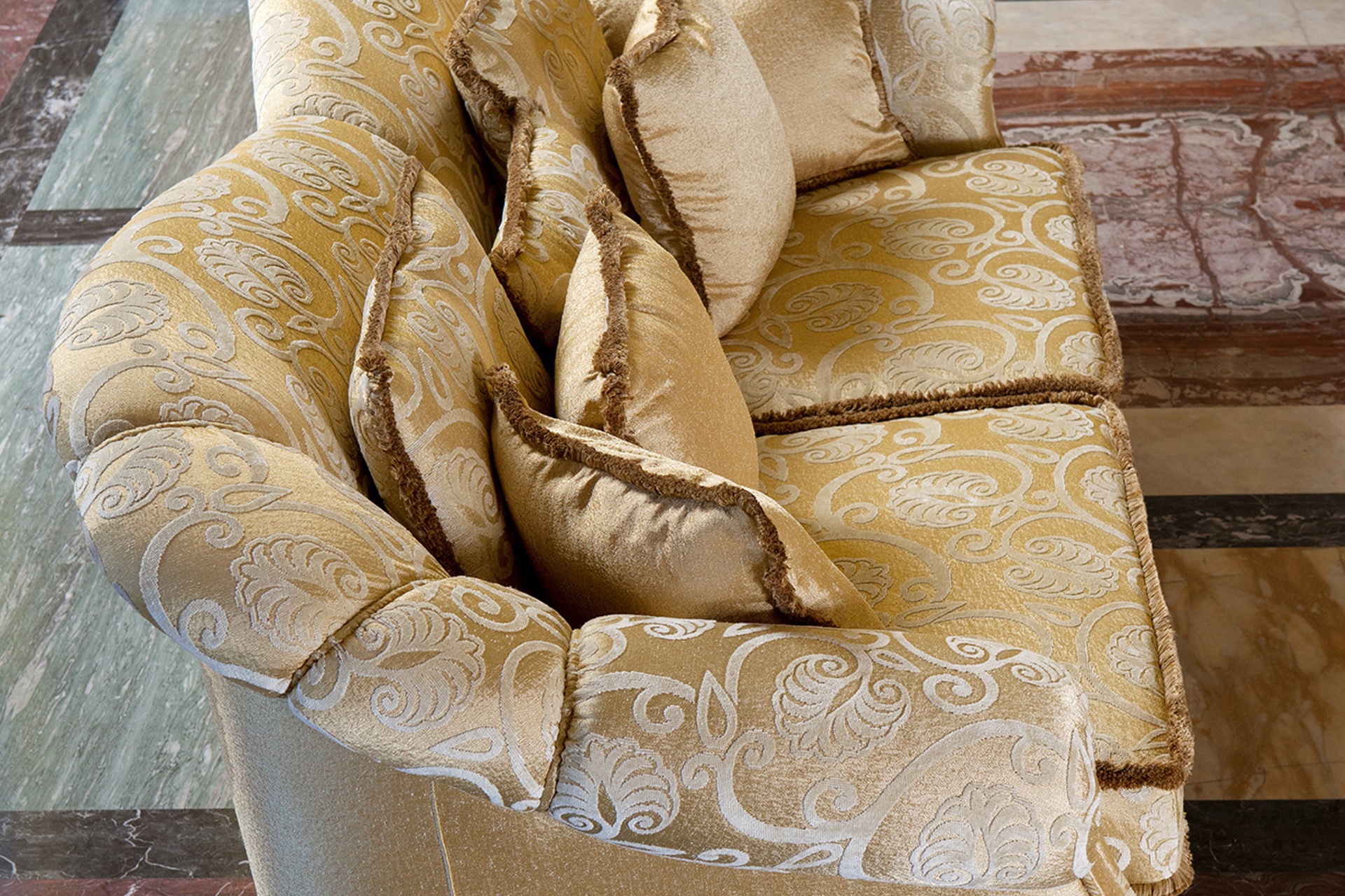 Sofa Zeryba from the collection Home from the Italian manufacturer Domingo Salotti. The luxurious sofa in the Baroque style adorn the living room or boudoir. The folding model can be used as a bed. The frame is made of solid poplar or fir wood, welded steel mesh, filler - polyurethane foam of different densities and Dacron. Mattress height 12 cm covered with a cover made of cotton canvas. Available double and triple models. The back is curly, decorated with stitch, the seat trimmed with fringe. Roll armrests trimmed edging, the bottom of the sofa is decorated with skirts and braided fringe. Upholstery plain and pattern from a range of companies. Complement a set of decorative pillows. Colors to choose from a collection company.