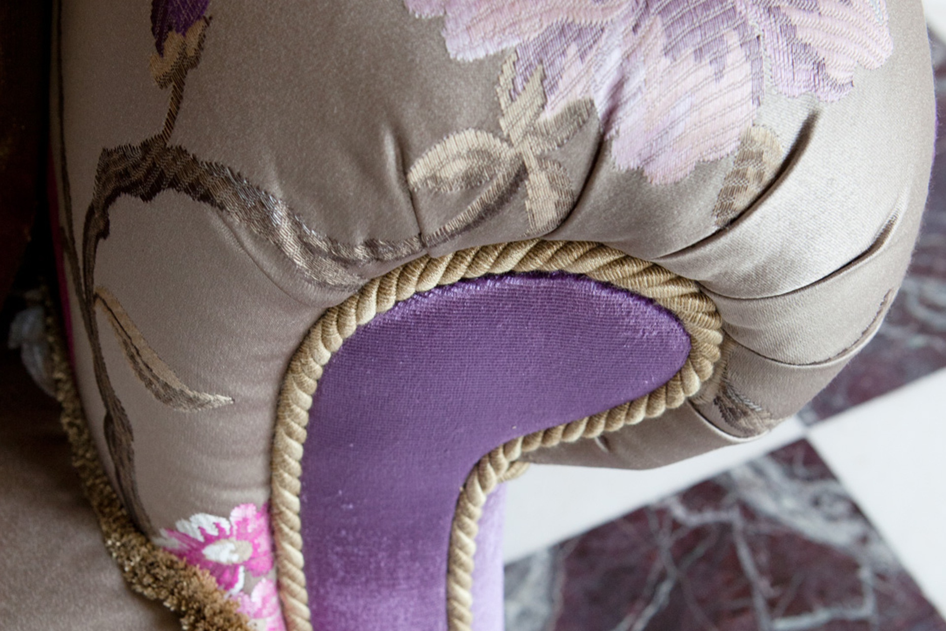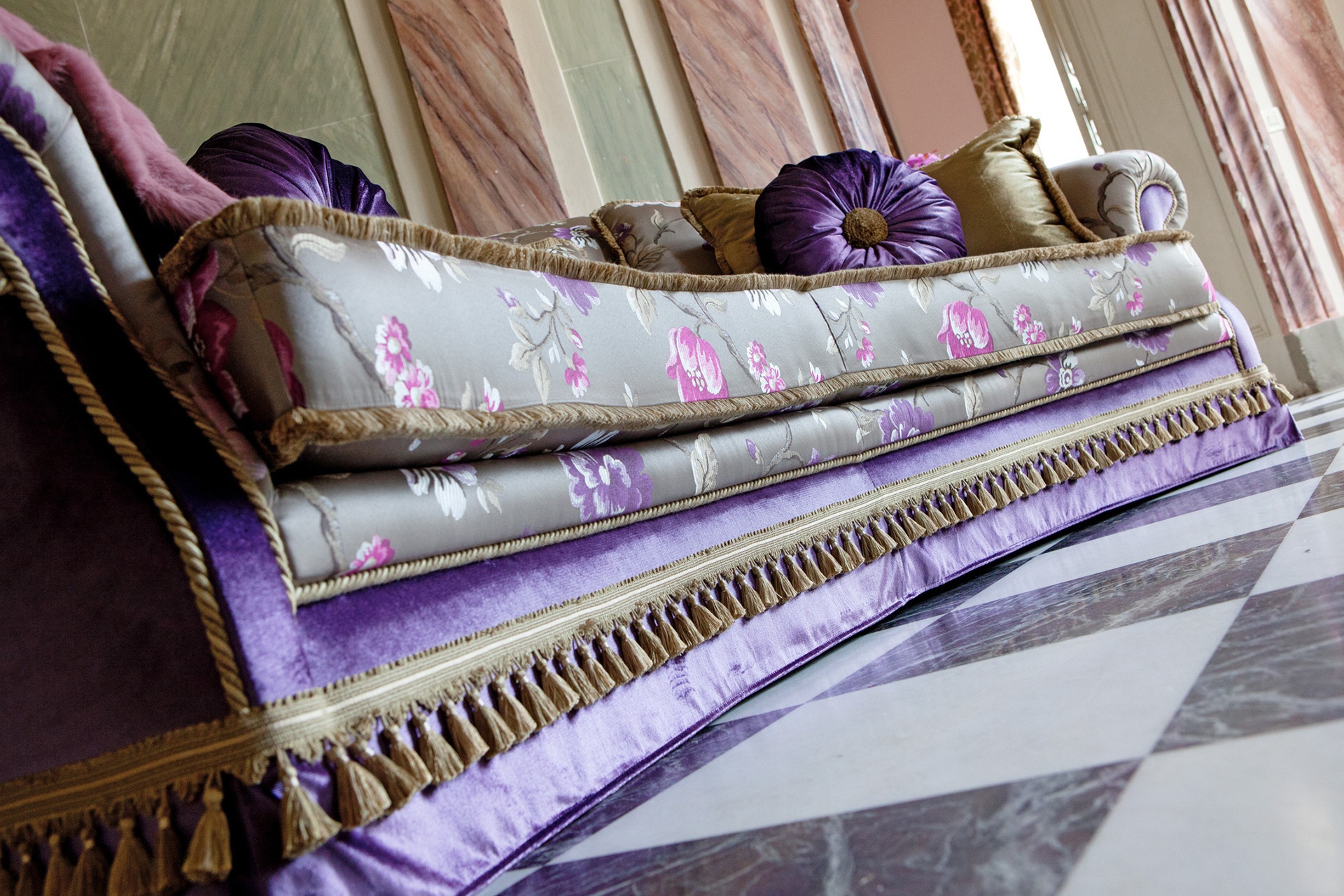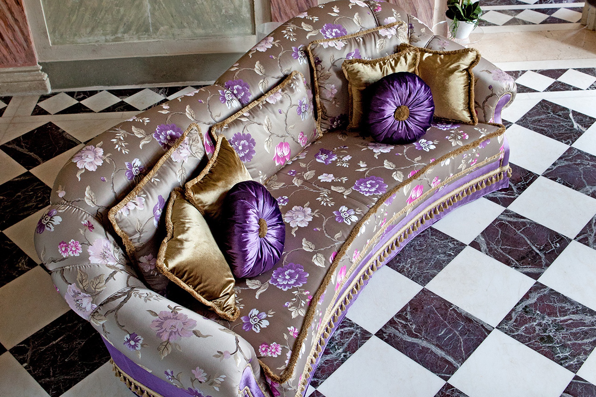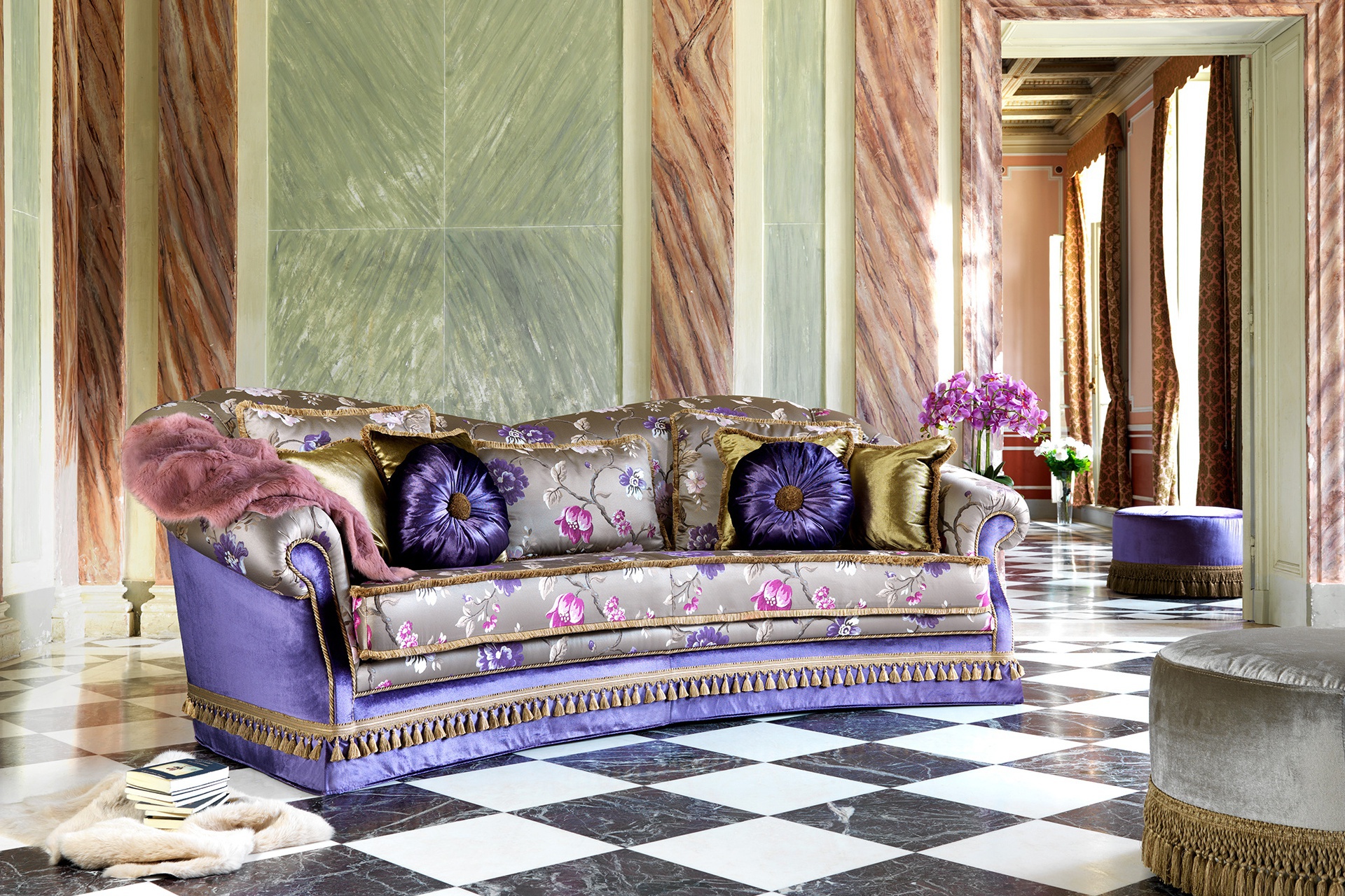 Sofa Zeryba curvo from the collection Home from the Italian manufacturer Domingo Salotti. The luxurious sofa in the Baroque style adorn the living room or boudoir. Model with fully concealed frame made from solid poplar or fir wood, filler - polyurethane foam of different densities and Dacron. Available triple and quadruple models. The back is curly, decorated with stitch, the seat trimmed with fringe. Roll armrests laid pleats and trimmed with edging, the bottom of the sofa is decorated with skirts and braided fringe. The front is carved in the form of a Crescent. Upholstery plain and pattern from a range of companies. Complement a set of decorative pillows in different sizes and design. Colors to choose from a collection company.