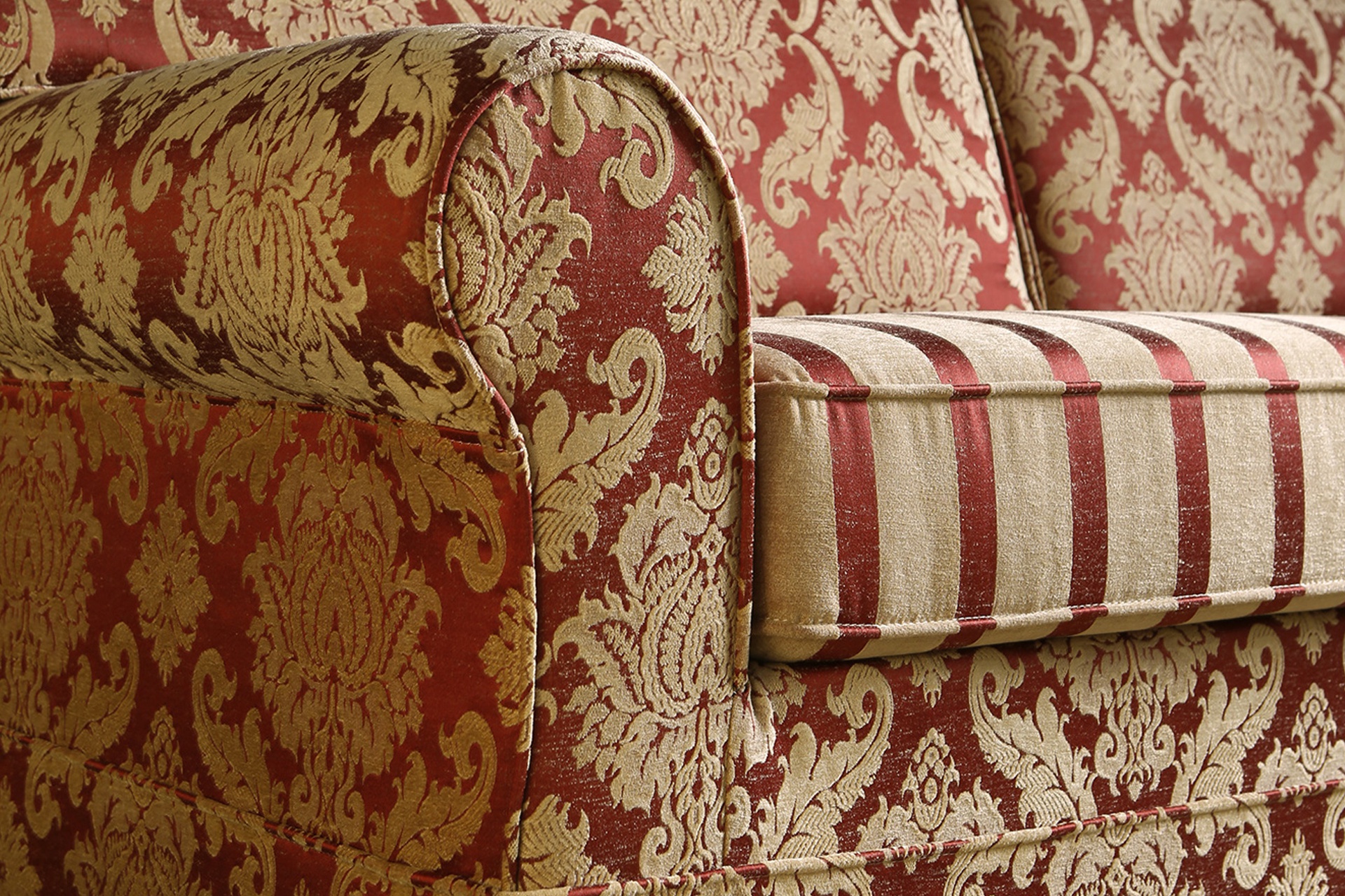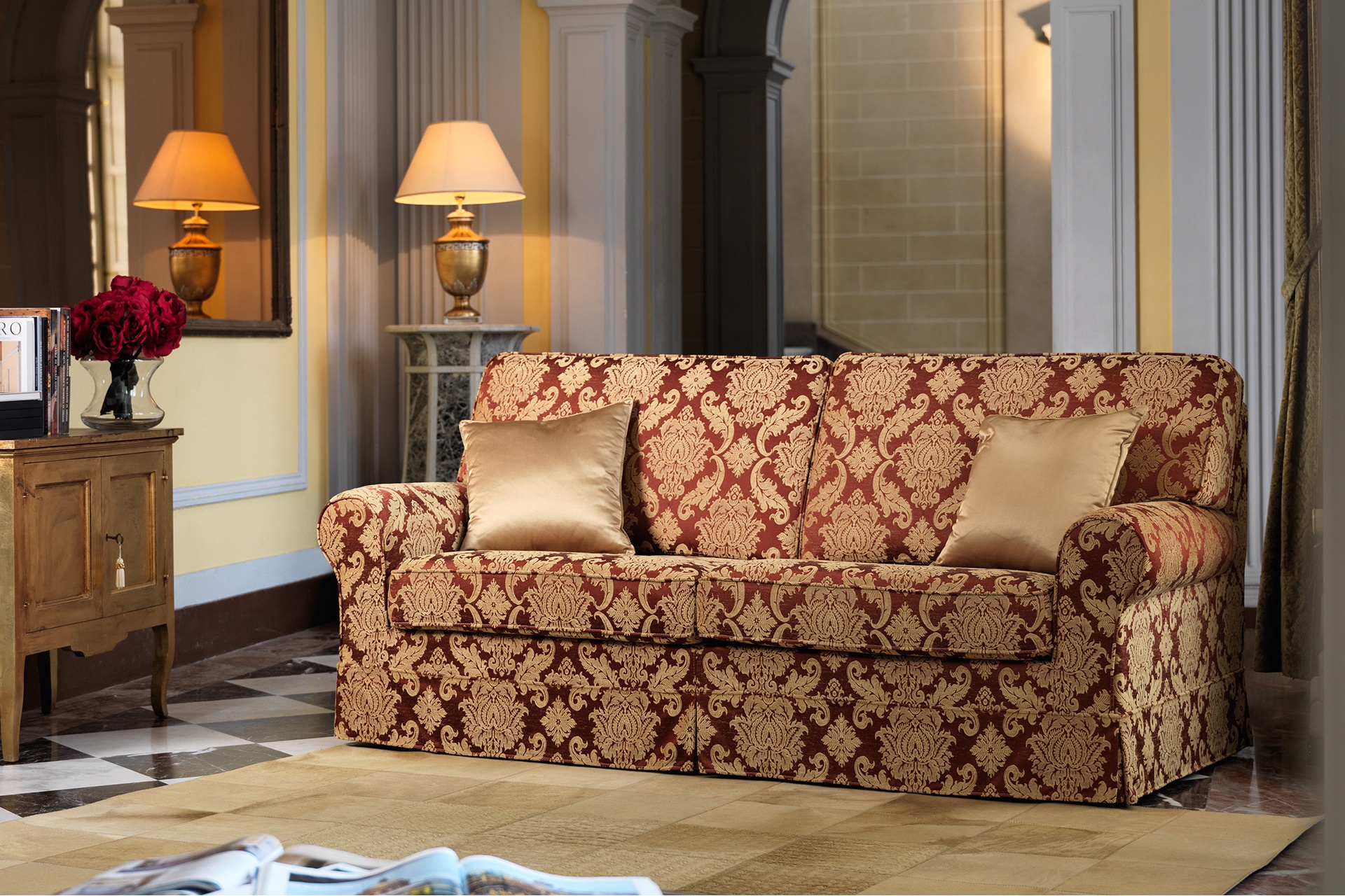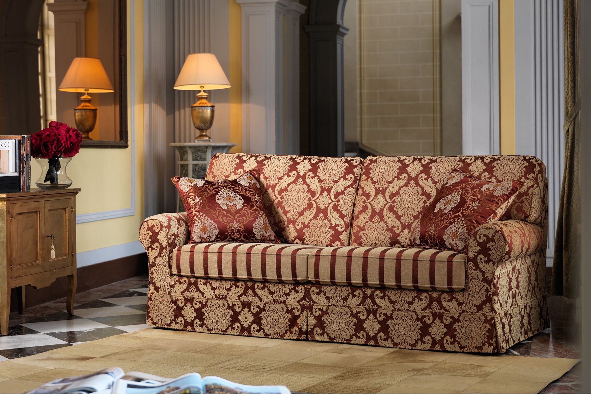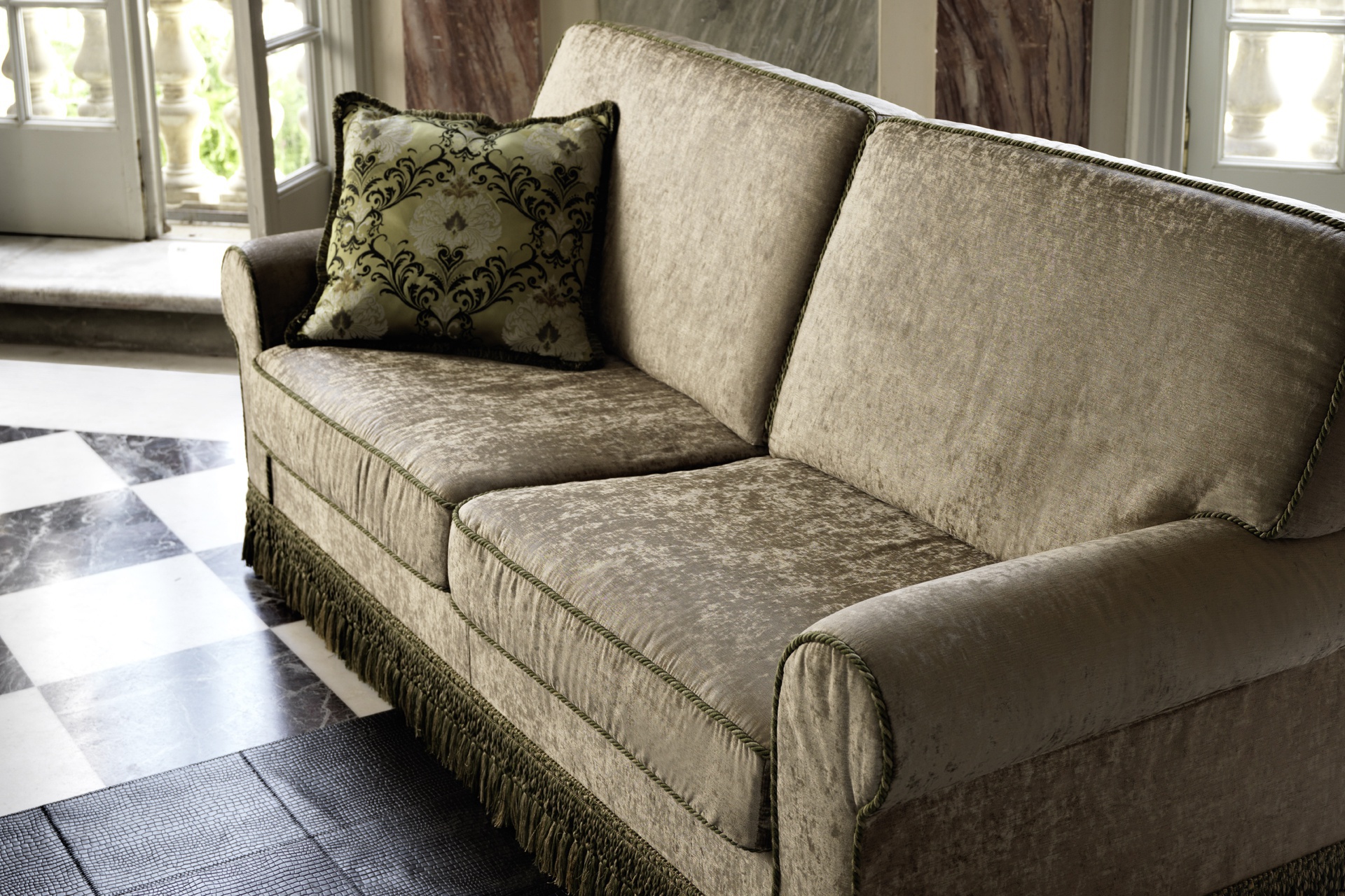 Zante sofa from the collection Home from the Italian manufacturer Domingo Salotti. Sofa classic proportions with a completely hidden frame will decorate the living room or boudoir. Made in the style Neoclassicism. Available double and triple models. The sofa can be used as a bed. The frame is made of solid wood of poplar or fir. Welded steel mesh in 2 addition, the filler - polyurethane foam of different densities and Dacron. Mattress height 12 cm in the case of cotton canvas. Upholstery textile, plain or pattern, cushions and backrests trimmed edging, the underside of a couch decorated with braided or fringed skirts. Complement a set of decorative pillows. Colors to choose from a collection company.