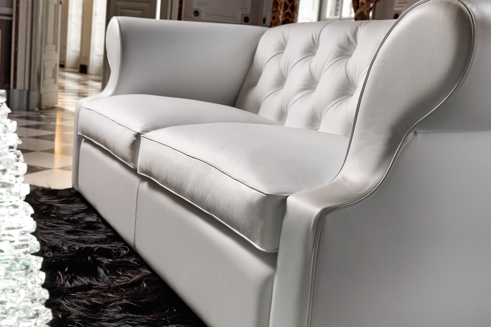Benjamin sofa collection Home from the Italian manufacturer Domingo Salotti. The simple and elegant silhouette of the sofa, executed in classical style, will decorate the living room or study. Available double, triple and quadruple models. The sofa elements are partially removable, can be used as a bed. The frame and legs solid wood, poplar or pine. Welded steel mesh in 2 addition, the filler - polyurethane foam of different densities. Mattress height 12 cm in the case of cotton canvas. Upholstery leather or textile from the company portfolio. The outline of the sofa are finished stitching or contrasting piping, the back is decorated with stitch Capito. Complement a set of decorative pillows. Colors to choose from a collection company.