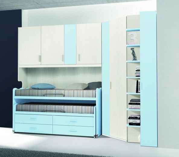 Set for children's Smail P07 from Italian producer Julia Arredamenti. The model is made in modern style. Designed for two children. The body is made of wood. Accessories metal. The surface is treated with glossy varnish, white and blue.