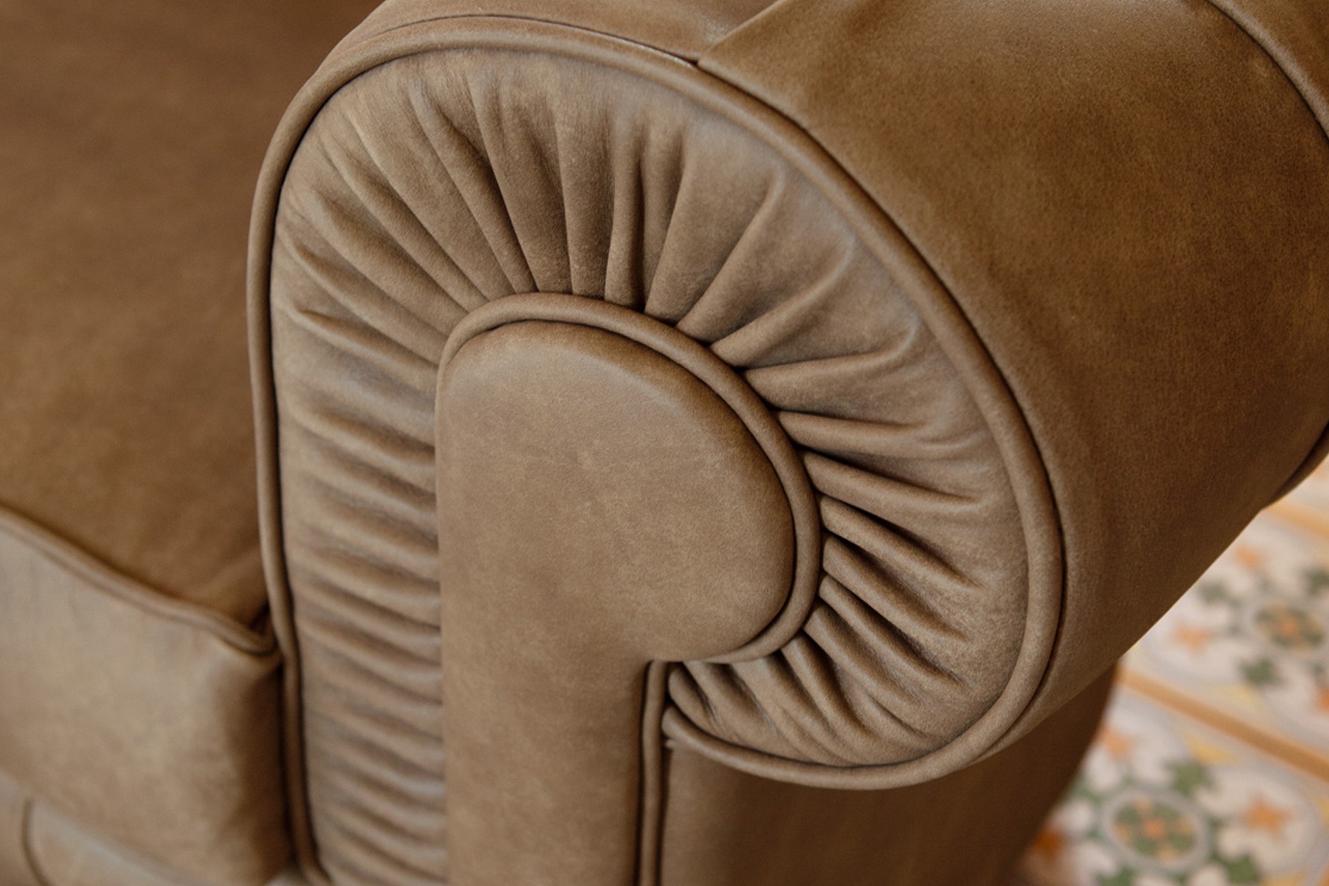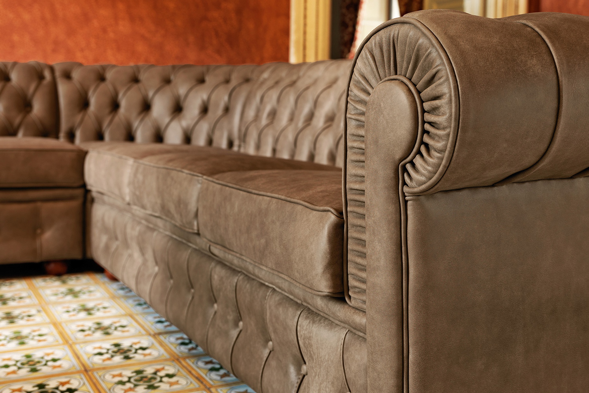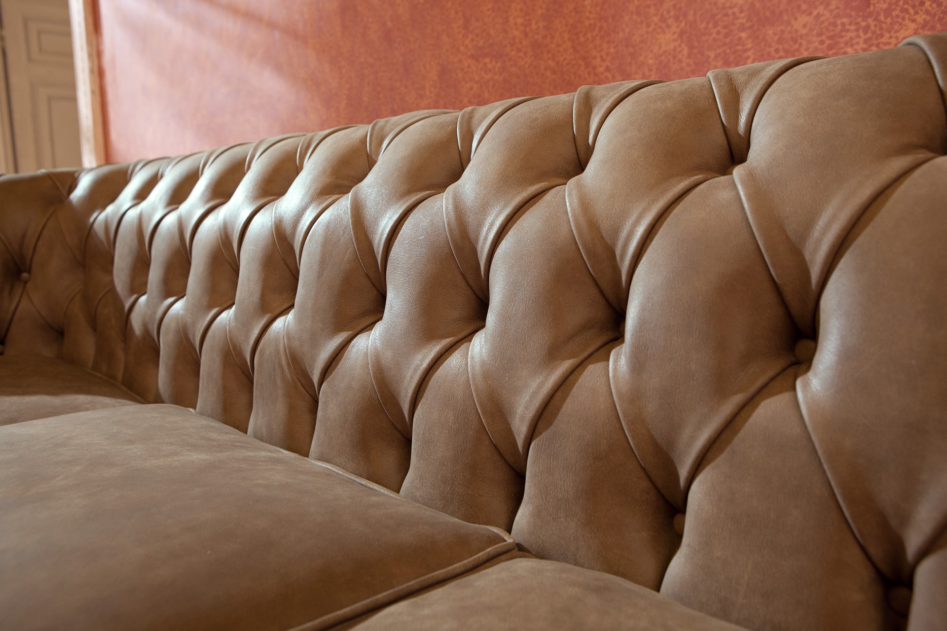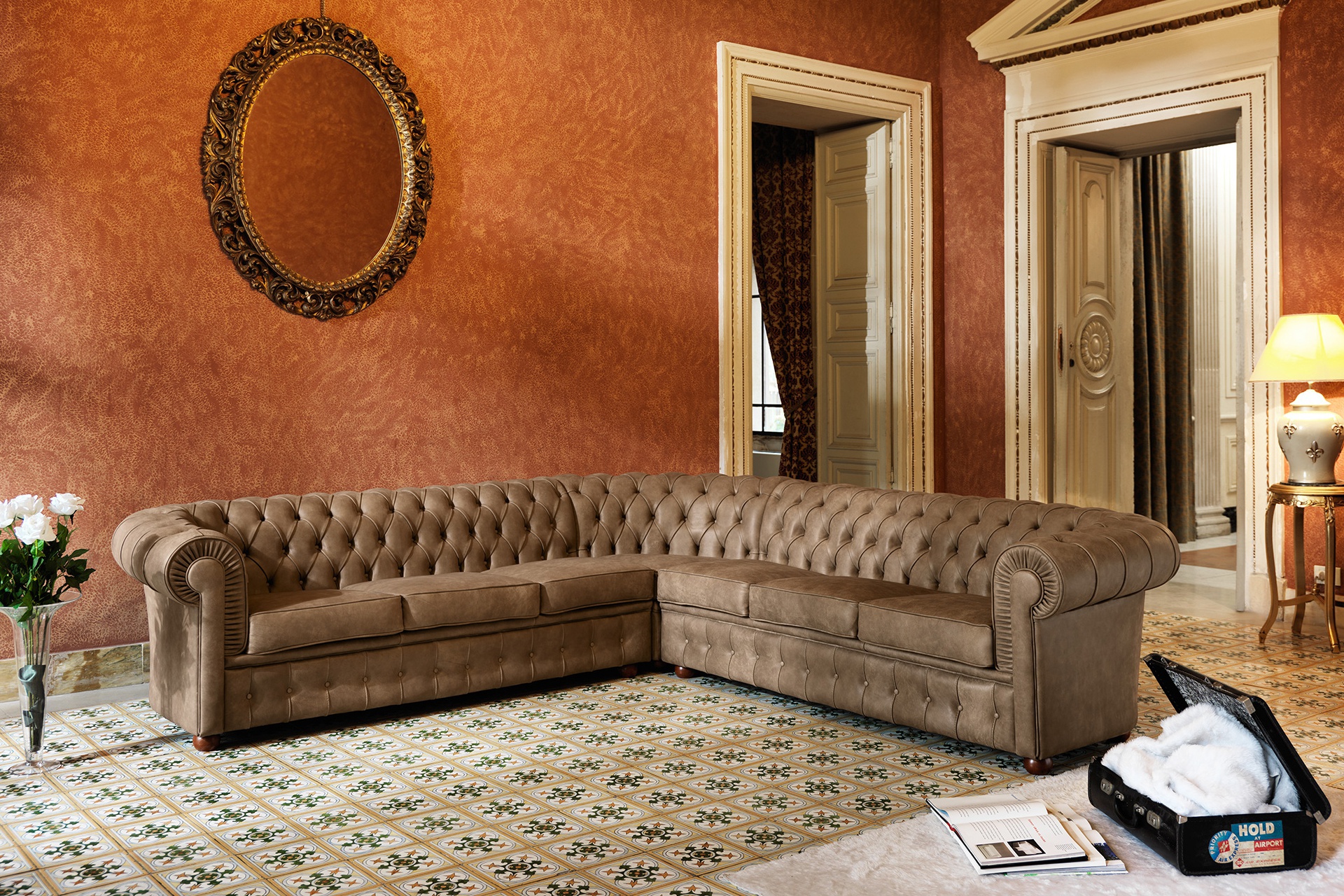 Modular corner sofa from the collection Ottocento Home from the Italian manufacturer Domingo Salotti. Elegant quilted Chesterfield sofa made in the English style. Modular sofas are not strictly given configuration, it is defined by the customer. Some options presented in the photo gallery. Frame made of poplar wood and pine, filler - polyurethane foam of different densities. Provided is a folding bed with welded steel mesh in 3 addition, mattress height 8 cm covered with a cover made of cotton canvas. Upholstery leather or textile is plain from the company portfolio. The armrests are rolled, draped pleats, one height with a back. The finishing of the sofa is stitch Capito with decorative buttons. Colors to choose from a collection company.