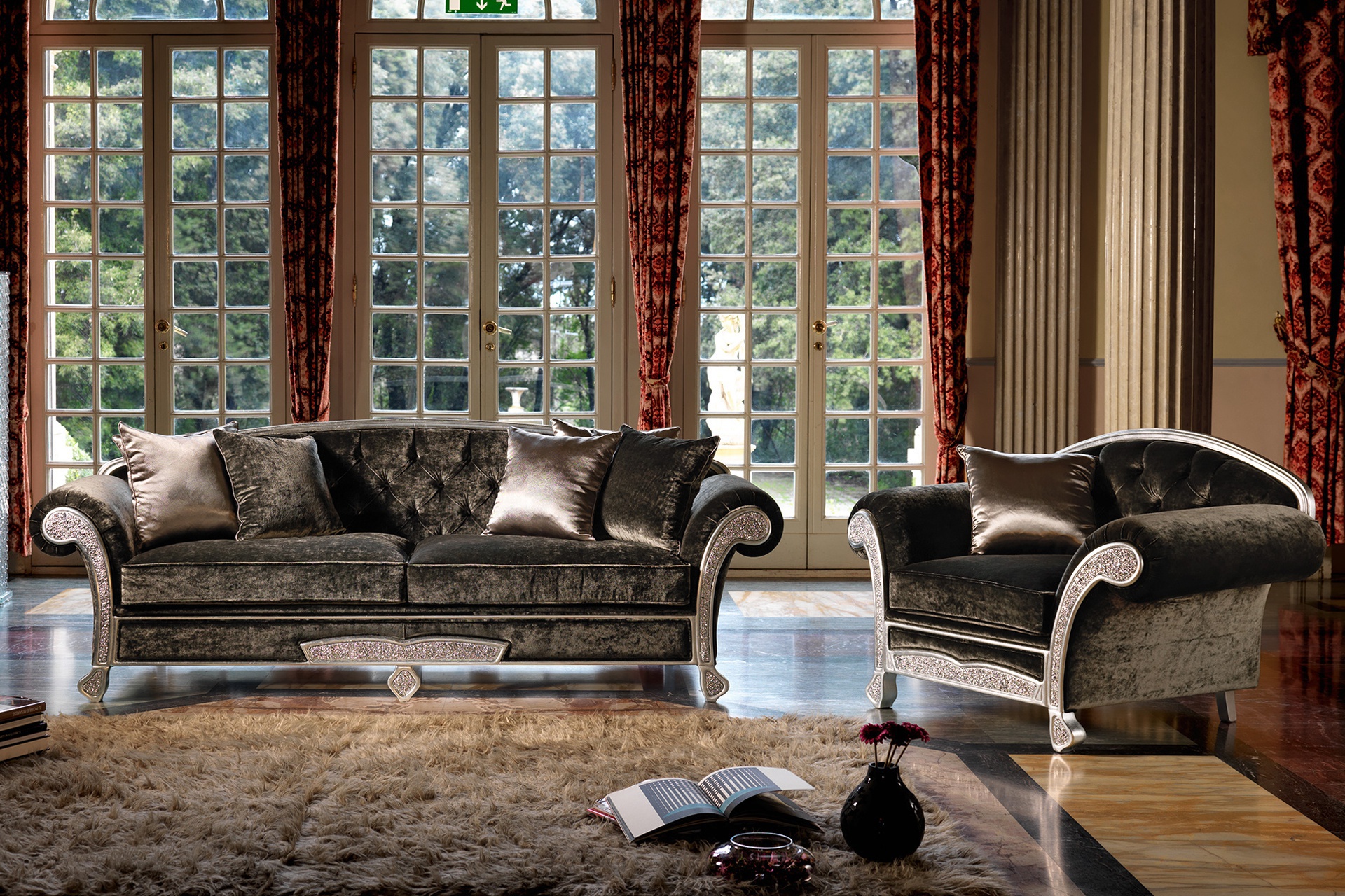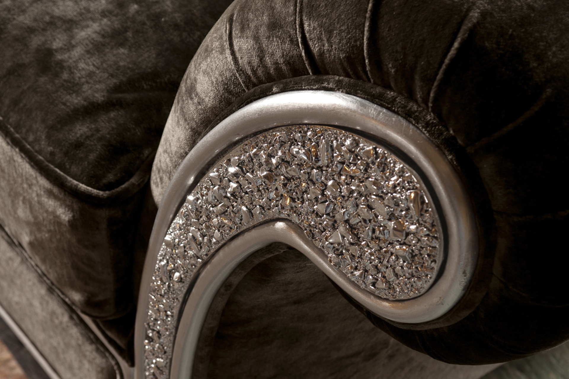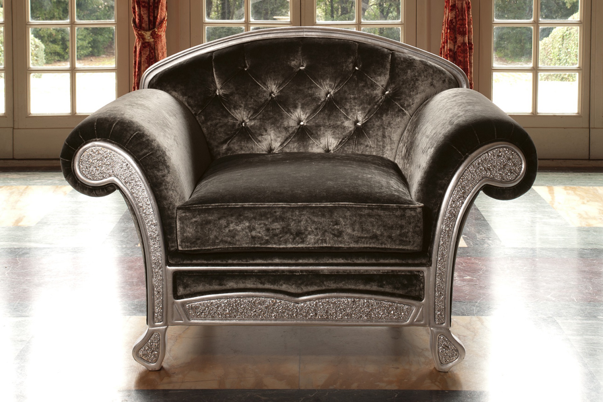 Trevi armchair from the collection Home from the Italian manufacturer Domingo Salotti. A plush armchair in the art Deco style will be an effective look in the living room or boudoir. The frame and legs are made of solid wood of poplar or of fir, the filler - polyurethane foam of different densities and feather. Carved legs, rolled arms laid folds and bent, plain upholstery textile. The back is finished with stitch Capito. The front part of the chair is decorated with fused textured glass, white, black or with the addition of the metallic color pigment. Colors to choose from a collection company.