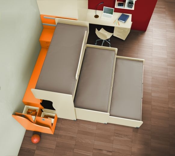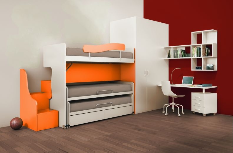 Set for children's C08 Smail from the Italian producer Julia Arredamenti. Model with three beds, a wardrobe, shelves, Desk and chair. Materials - wood and metal. Finish to be selected from the range of the company.