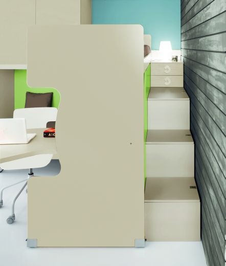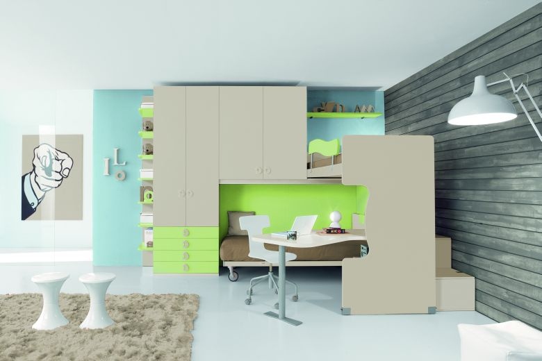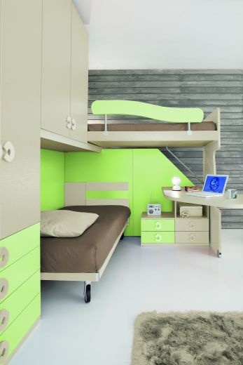 Set for children's Smail C13 from the Italian producer Julia Arredamenti. The model includes two beds, Desk, chair, wardrobe and shelves. The body wood. The surface is painted with lacquer. The color palette in the catalog of the company.