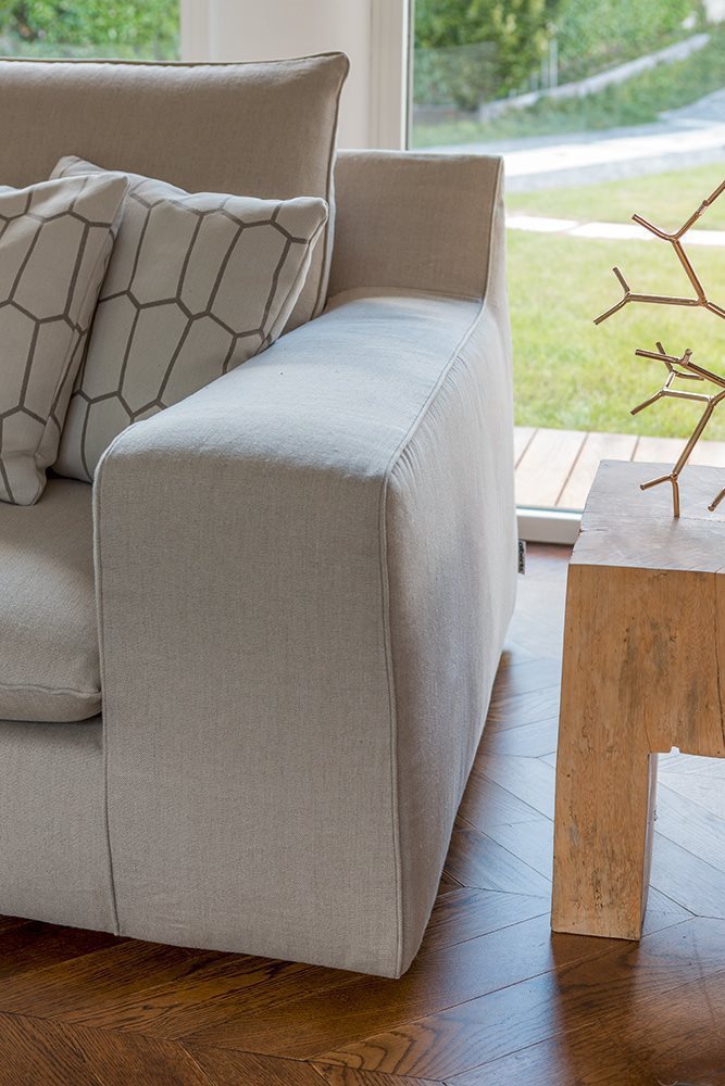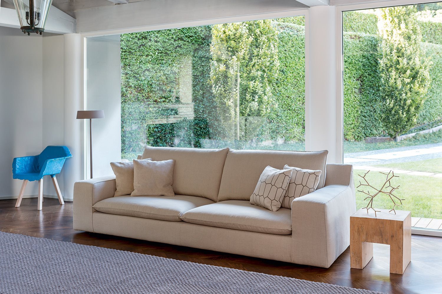 Miami double sofa from Italian manufacturer Alberta Salotti. Upholstery textile from the company portfolio. Filling - polyurethane foam (PUF). Rectangular pillow are removable. Color in a light tone. The perfect choice for a living room in modern style.