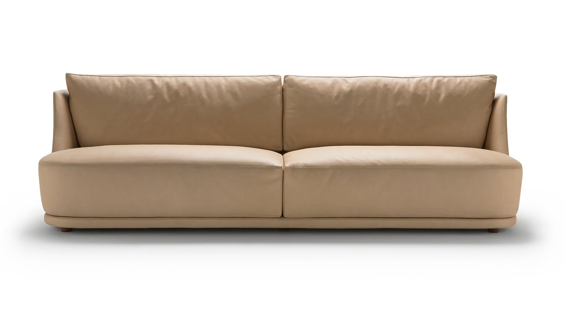 Vivien double sofa Italian manufacturer Alberta Salotti. The model of the sofa without legs with small armrests. Model with a semicircular shape. The frame is natural wood, the upholstery is of genuine leather or high quality textile. A modern solution for living room.