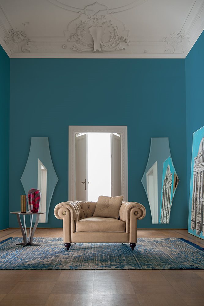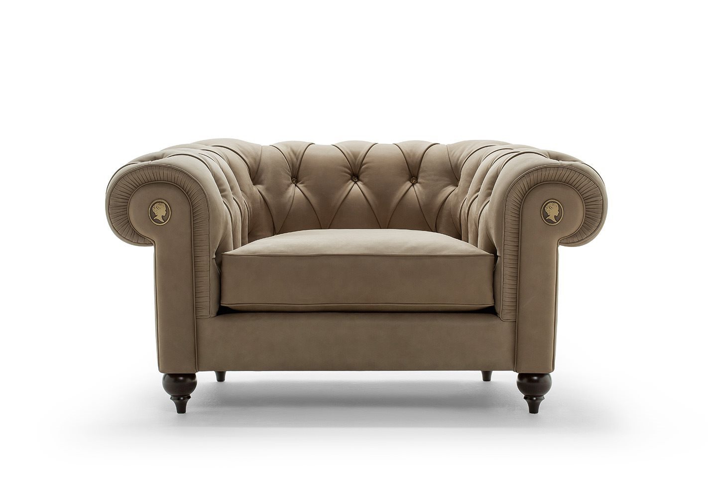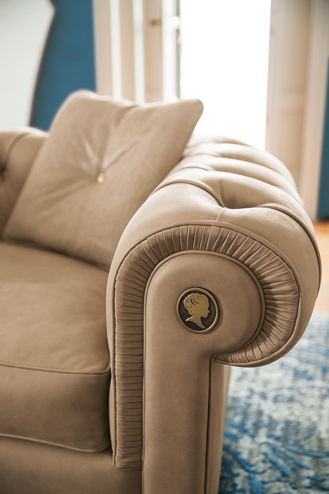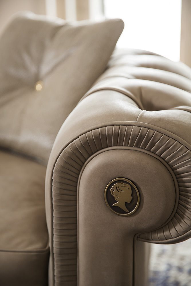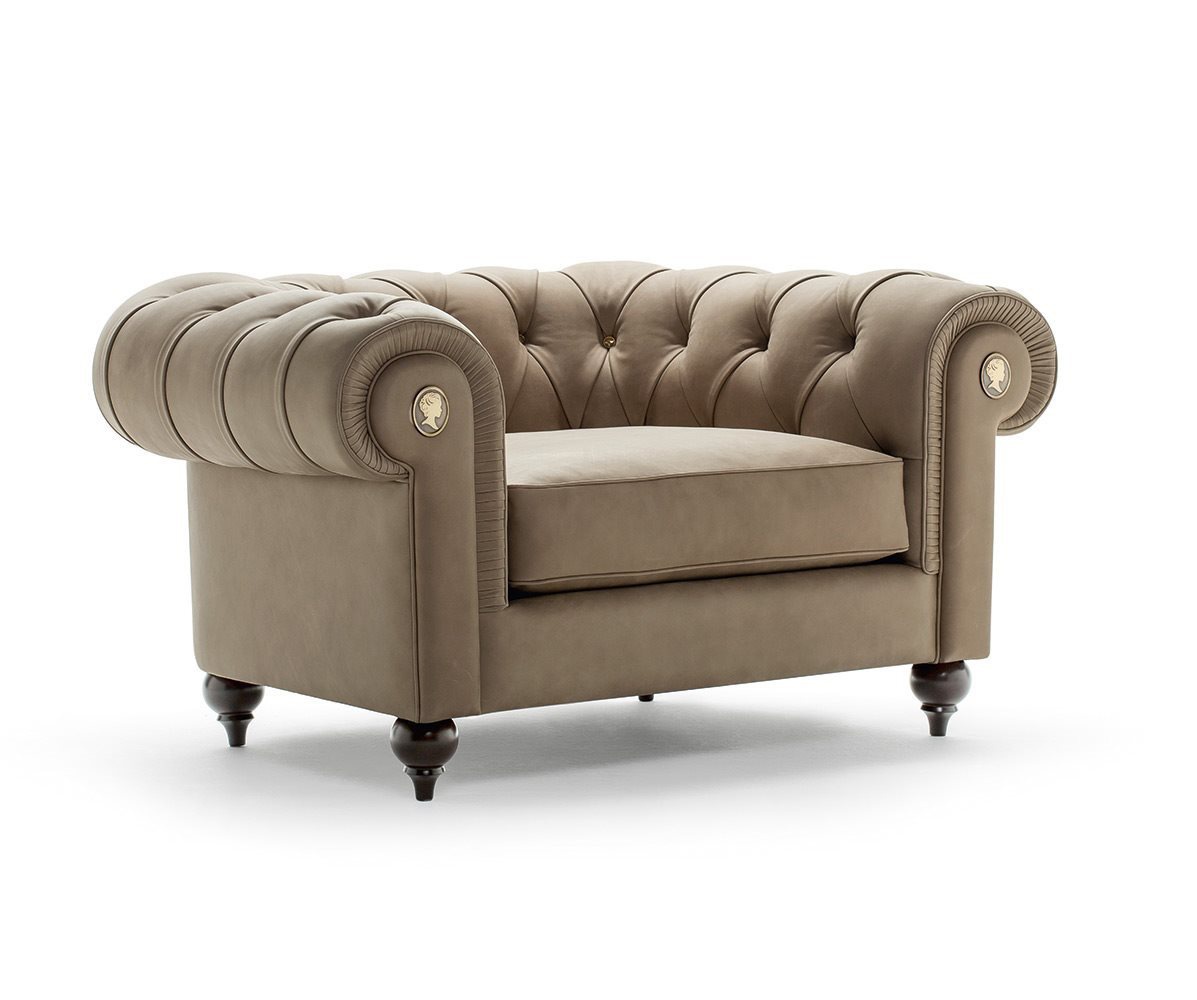 The Alfred chair round Italian manufacturer Alberta Salotti. Presents a model chair with a low backrest semicircular shape fades into the armrests. Chair soft finish stitch Capito. Legs low round shape. Seat cushion soft semicircular. Color in a gray tone. The armrests are decorated with original brooches. A modern solution for living room.