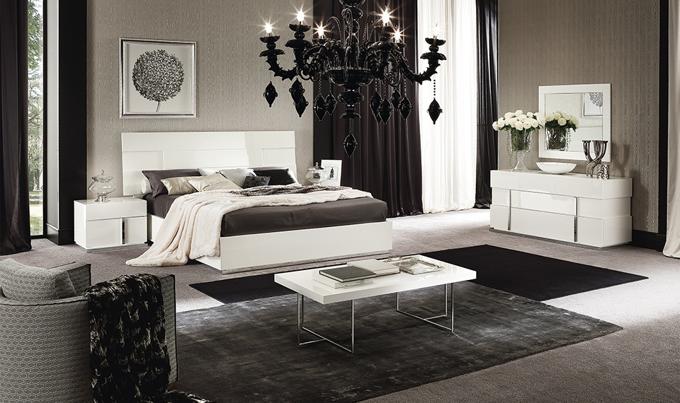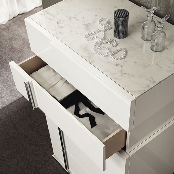 Set for bedroom Canova from the Italian manufacturer Alf. Set includes a bed on a podium with high headboard, bedside Cabinet and a low chest of drawers with marble top, highboy, dressing table with opening top with mirror, wall mirror. The furniture is made of solid wood. Finish - white lacquer with a glossy finish, you can choose the shade in the catalog. Fittings, base metal.