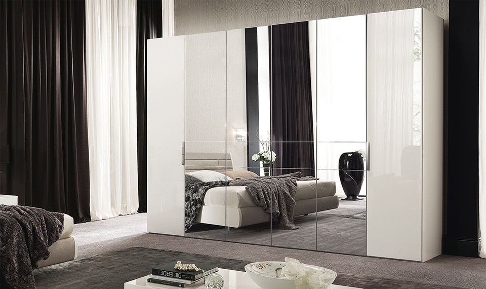Set for bedroom Canova from the Italian manufacturer Alf. Set includes bed with high headboard in leather/textile, bedside tables, chest of drawers, dressing table with opening top with mirror, wall mirror, wardrobe with mirrored frontage. The furniture is made of solid wood. Finish - lacquer white gloss, upholstery - leather shade of mocha, you can choose shades from the range. Fittings made of metal. The style is modern.