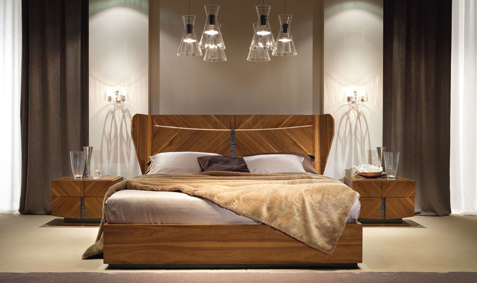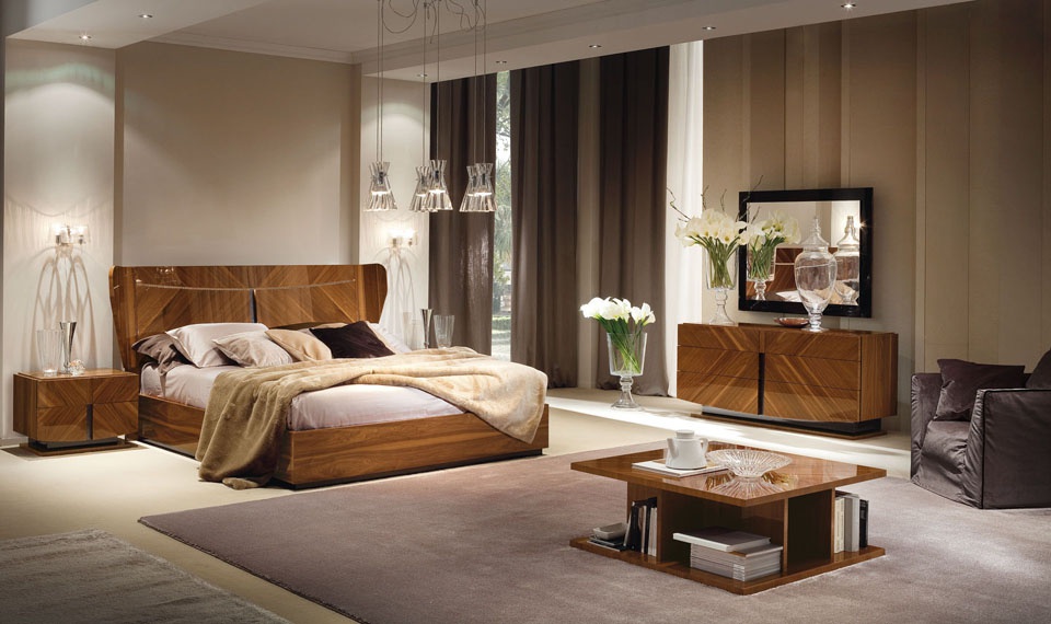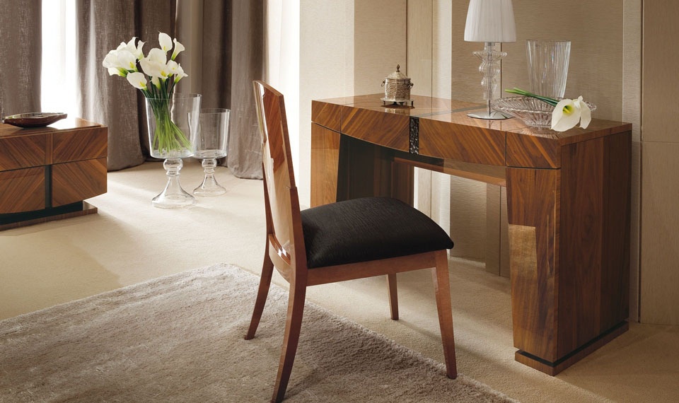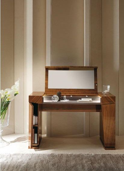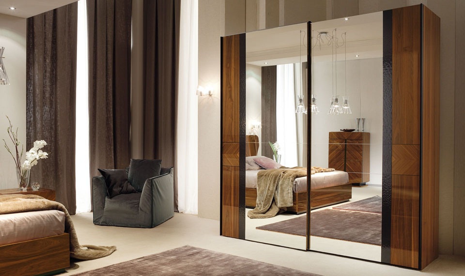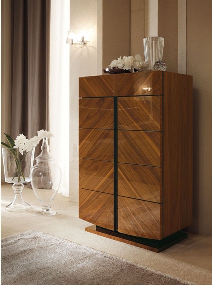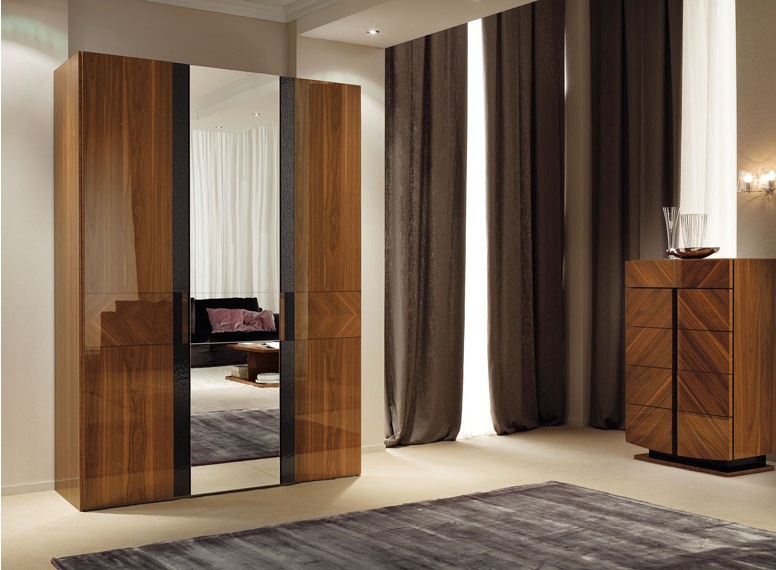 Set for bedroom Opera from the Italian manufacturer Alf. The set includes bed with high headboard, bedside table, 2 drawers, wall mirror, wardrobe with mirror door or without, a dressing table with hinged top, fitted with mirror. Products made of solid wood. The veneer finish is in gloss lacquer, choice of finishes from the range. The decor is a figure of natural fibers. The style is modern.
