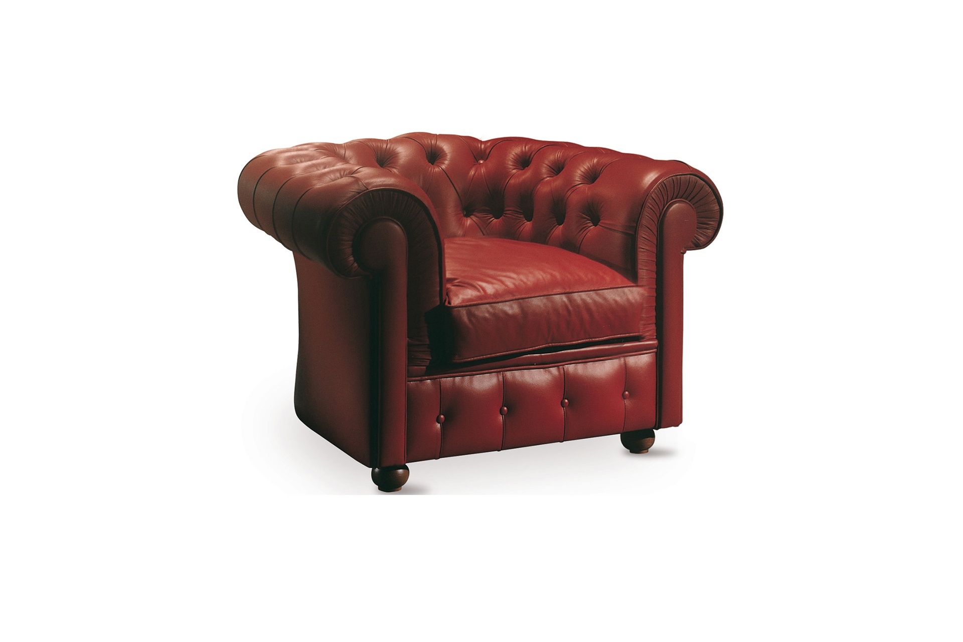 800 chair from a collection Contract from the Italian manufacturer Domingo Salotti. Elegant Chesterfield armchair, designed in the English style, decorate living room, library or study; it is also suitable for public spaces. The small frame and round legs made of wood. The soft backrest and rolled armrests the same height, upholstered in textile or leather from the company's range, the filler is polyurethane foam. The backrest and the armrests are embellished with stitch Capito. Seat cushion with extra volume, armrests laid in beautiful folds. Colors to choose from a collection company.