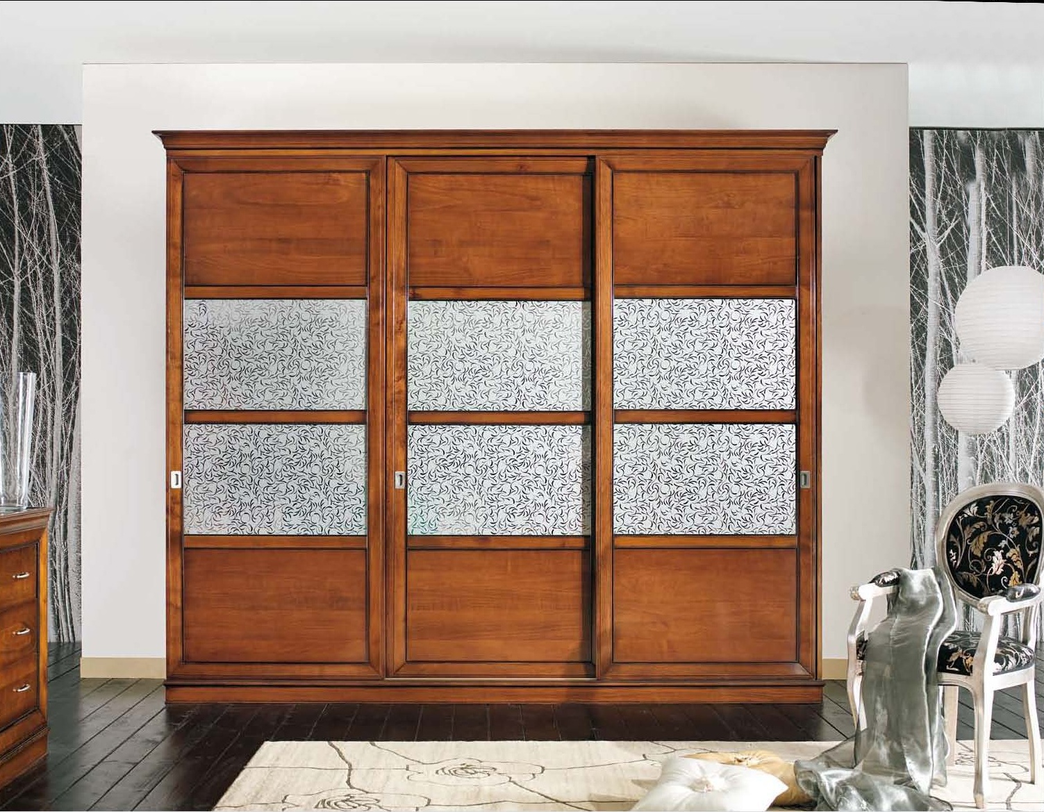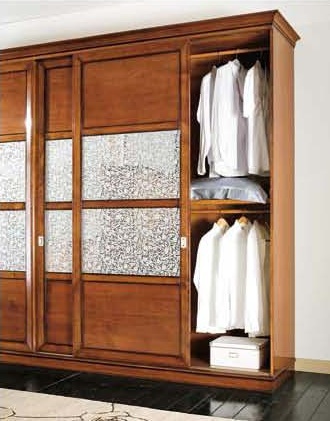 Wardrobe from the Italian manufacturer Mirandola Export. The wardrobe has three sliding doors with inset glass. Within the model there are shelves, racks and drawers. The product is made in a classic style. The frame is made of wood. Beautiful Cabinet will add elegance and comfort to Your bedroom.