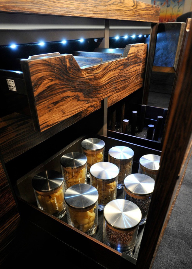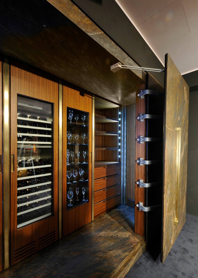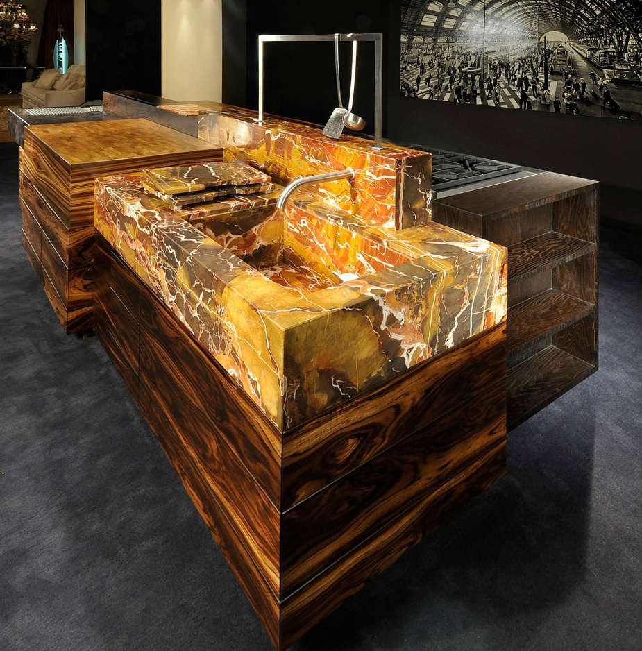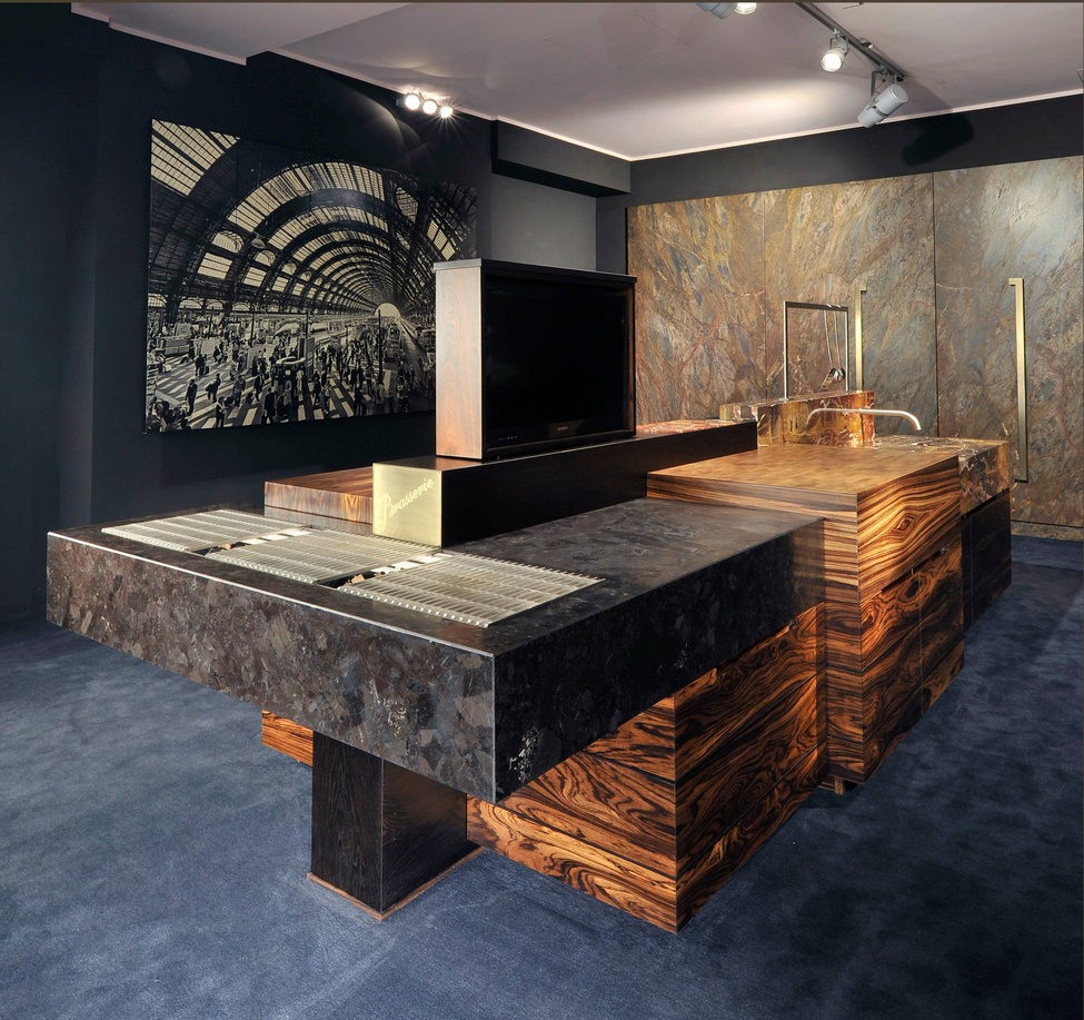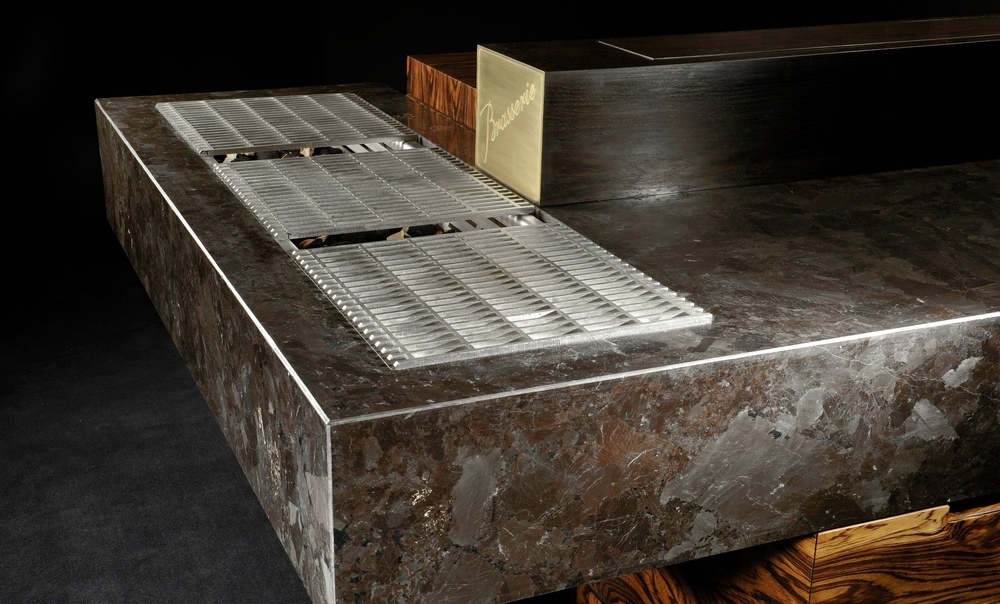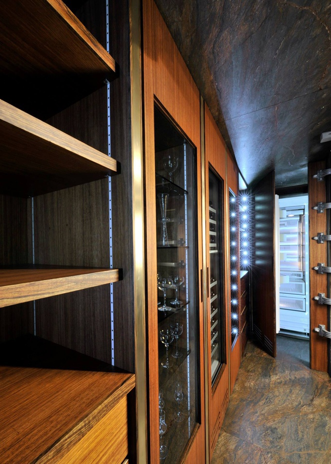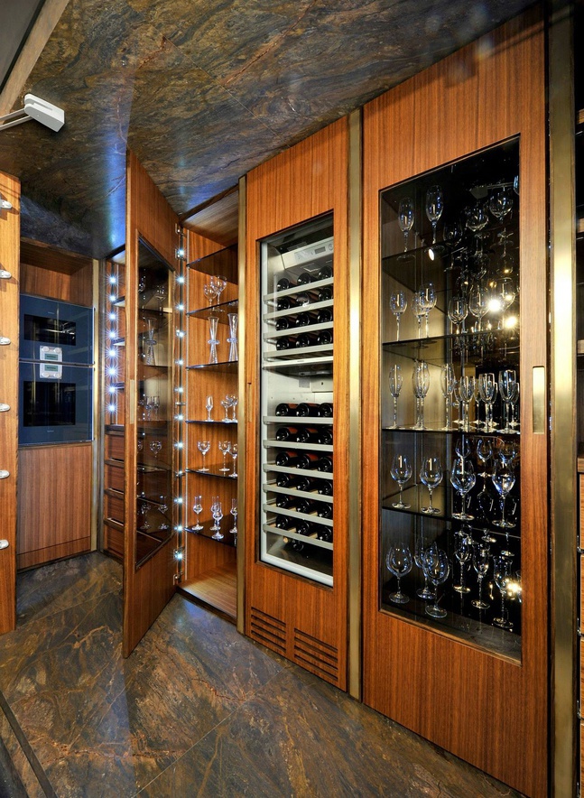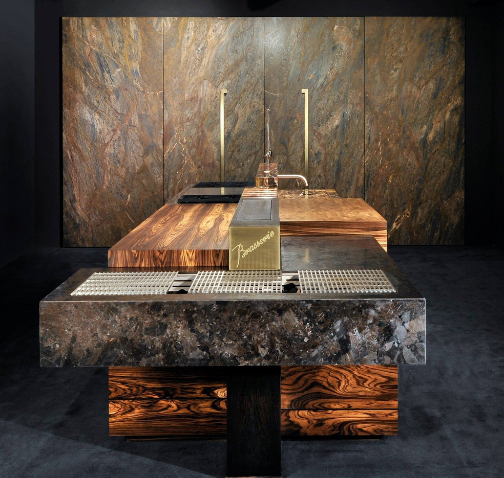 Kitchen (kitchen) from Brasserie Italian designer Matteo Gennari. Luxury kitchen in modern style represents the Union of classic comfort and innovative design. The design - contrasting textures of natural wood combined with quiet shades of natural stone. The frames of all items made of wood, countertops made of natural stone. High table island with open shelves for more convenient in operation. There is a wine cellar Cabinet with two hinged glazed doors and bottle holders, cupboards and storage with plenty of shelves specially adapted. The emphasis is on the performance of gold finishes and hidden handles. Colors and trim options and configurations in stock.