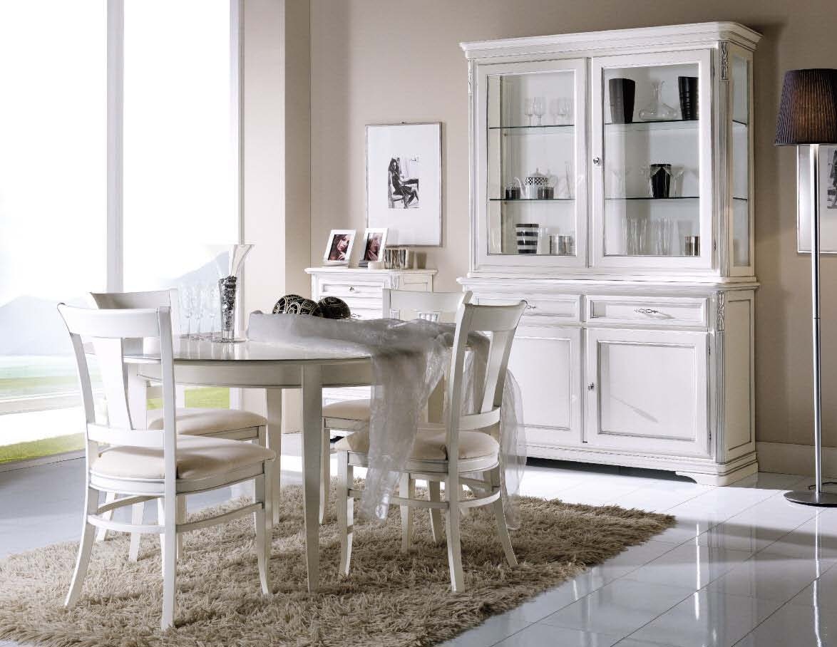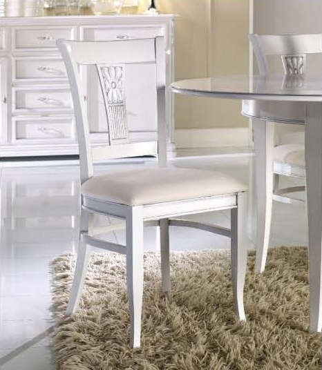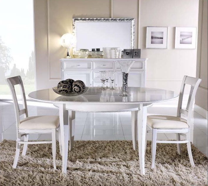 Dining room (dining set) from the Italian manufacturer Mirandola Export. Set is made in a classic style and has a frame made of wood. Set consists of a round extending dining table and chairs with upholstery textiles. The model is decorated with decorative carved pattern and silver finish. Elegant and delicate set will create a pleasant and welcoming atmosphere in Your dining room.