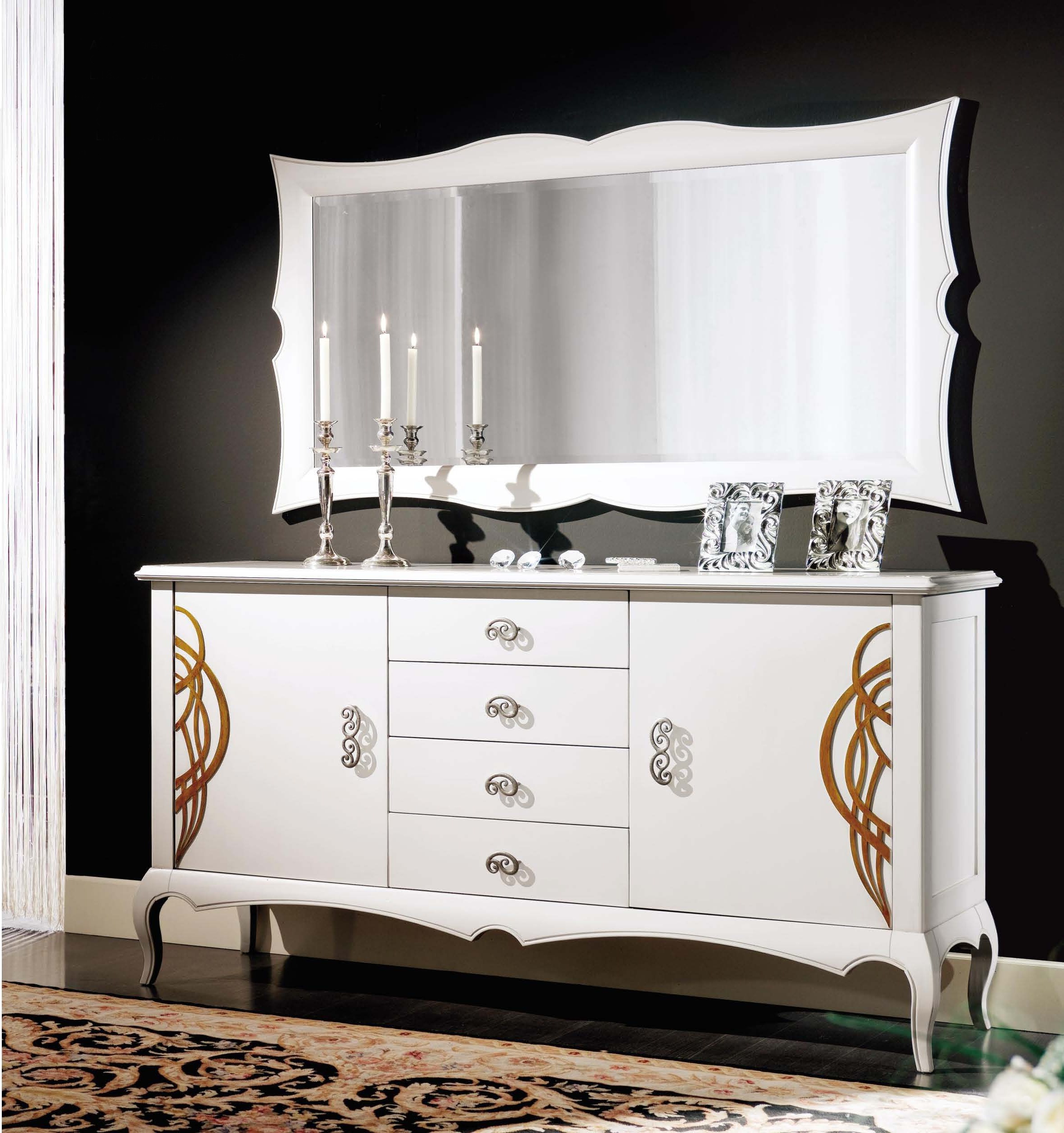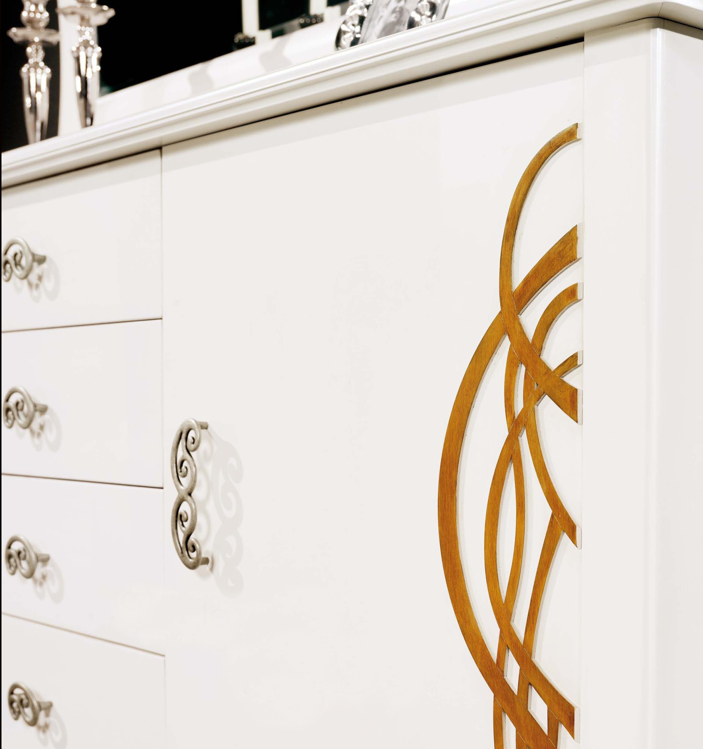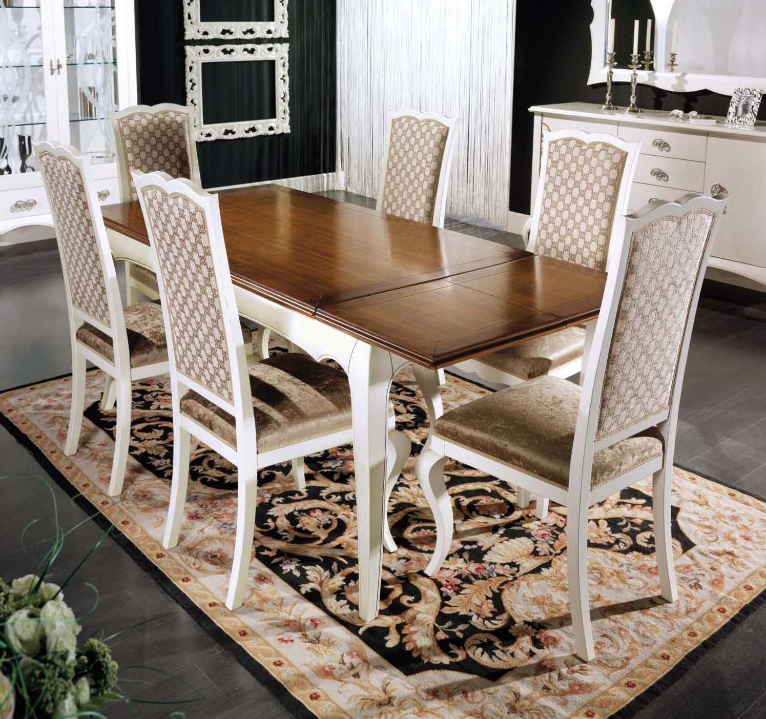 Dining room (dining set) from the Italian manufacturer Mirandola Export. Gorgeous set is made in a classic style and has a frame made of wood. Set consists of two door showcase with drawers, sideboard, mirror, extendable dining table and chairs with textile upholstery and high back. Mirandola Export set will create a cozy and pleasant atmosphere in Your dining room.