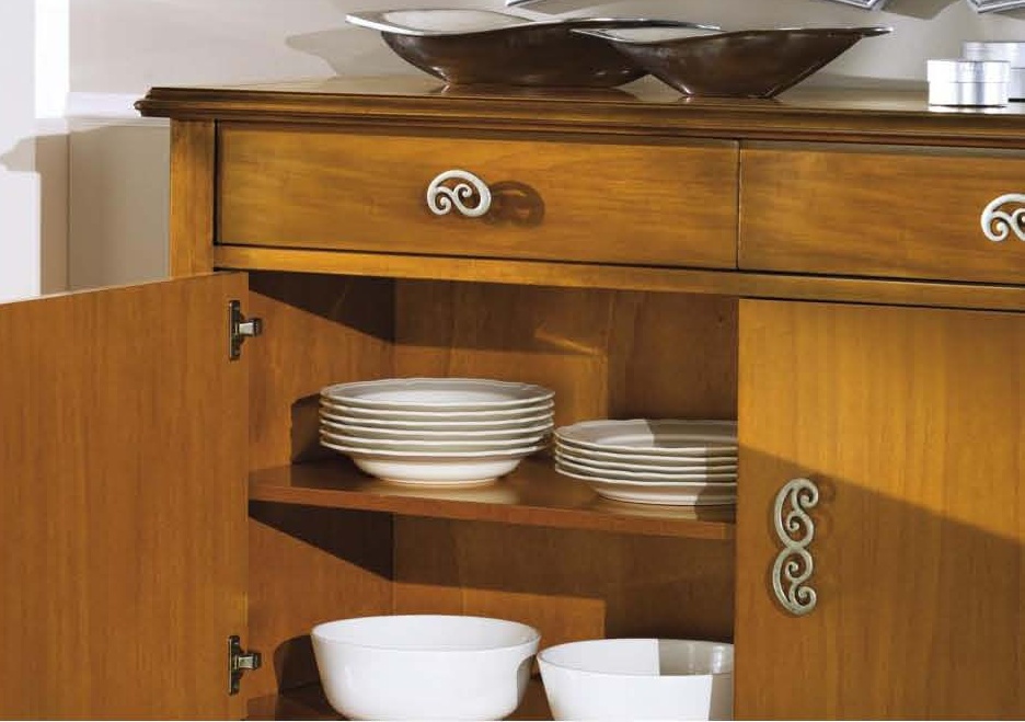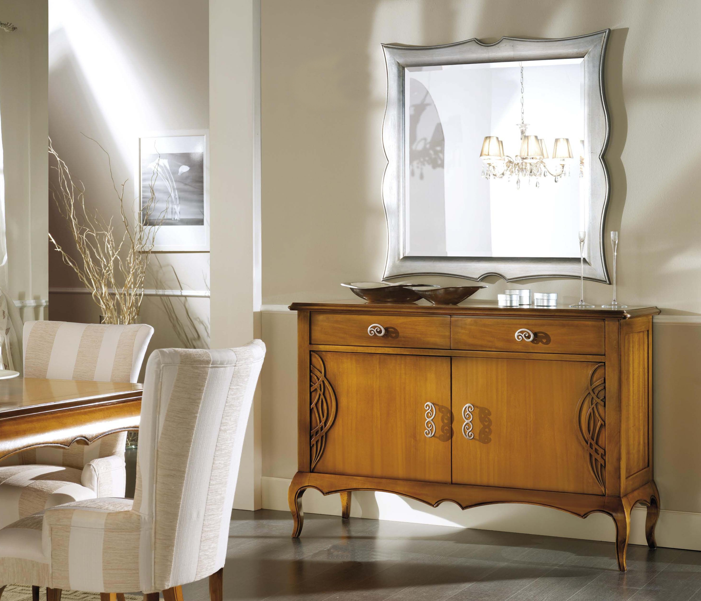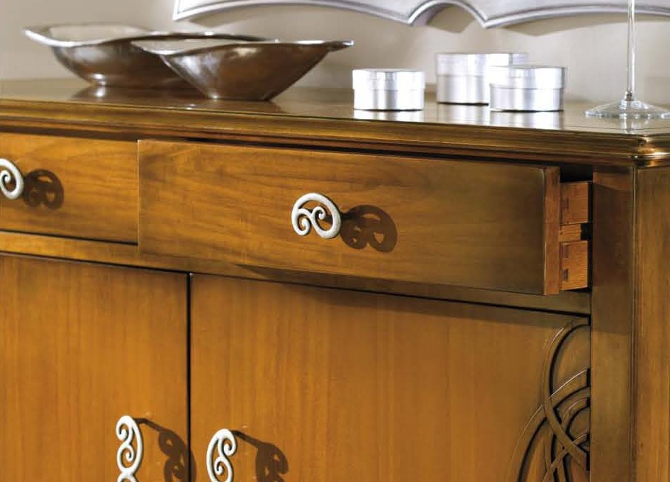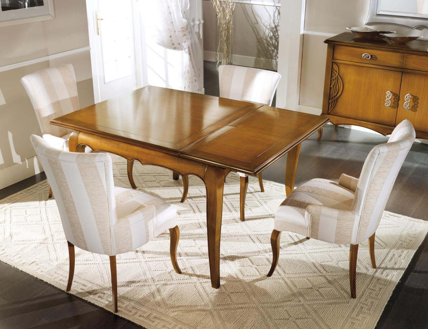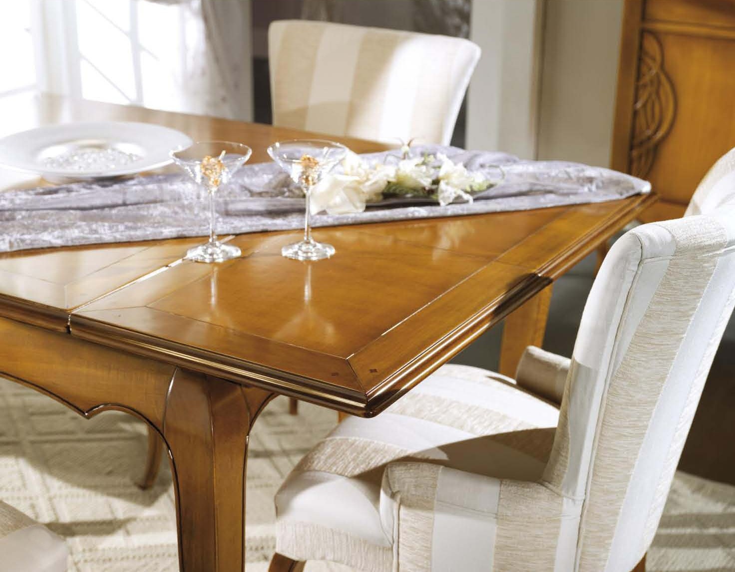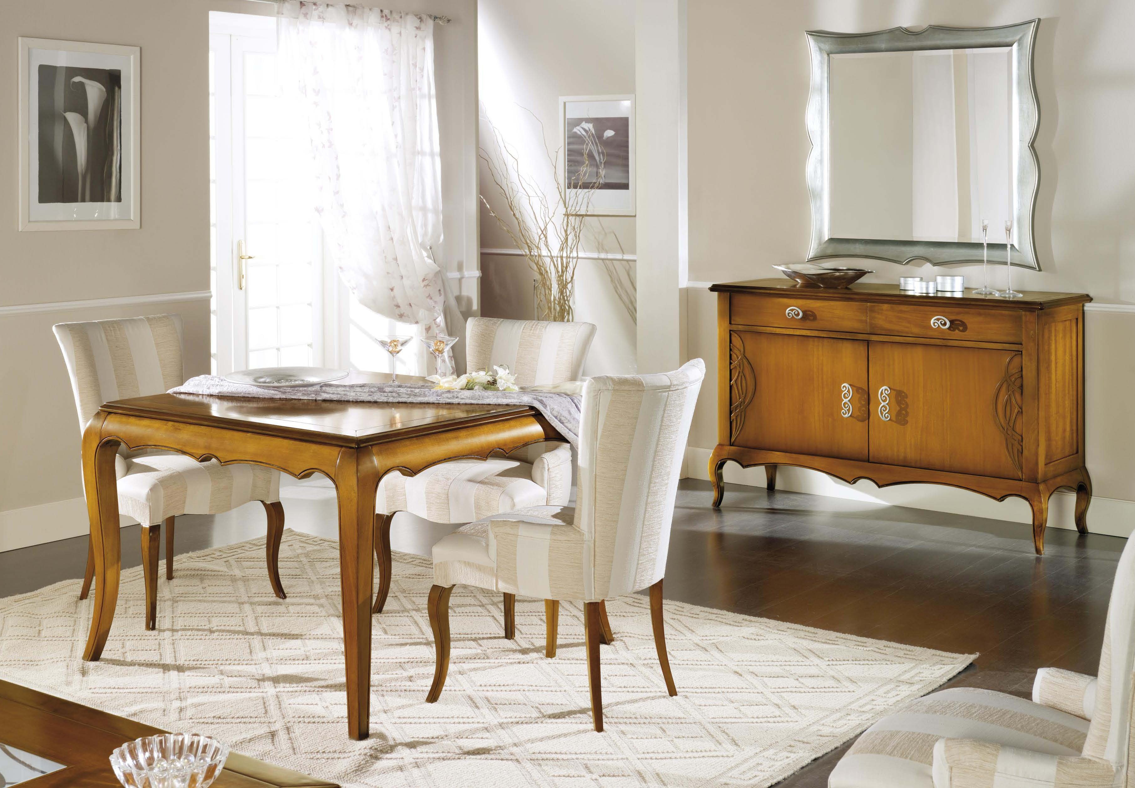 Dining room (dining set) from the Italian manufacturer Mirandola Export. Classic set consists of a square sliding dining table, chairs with soft upholstery, sideboard with drawers and curly handles and mirrors. The model is decorated with a decorative pattern. Beautiful set of Mirandola Export will beautify Your dining room.