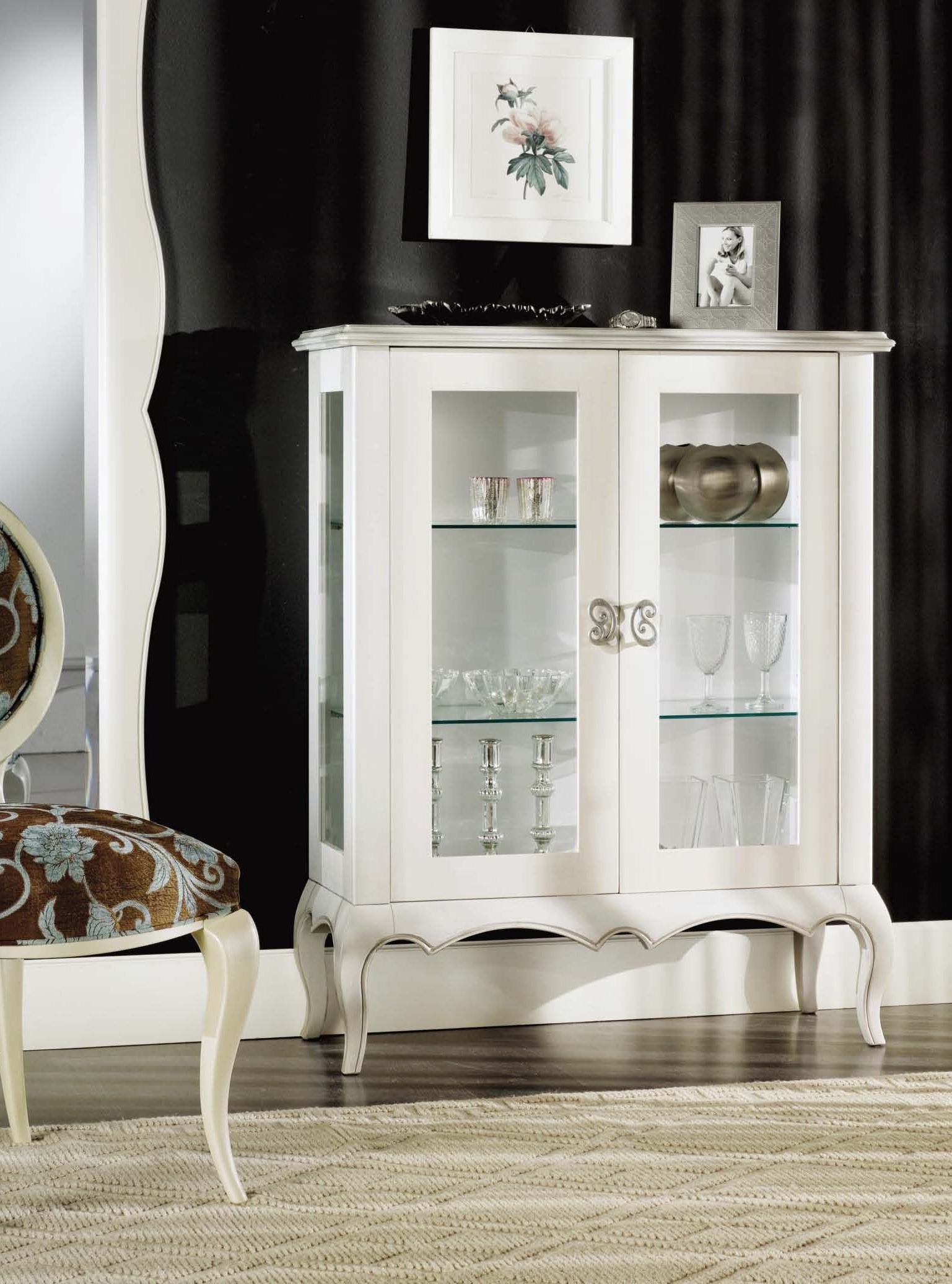 Showcase from Italian manufacturer Mirandola Export. Small size makes showcase delicate and exclusive. The model is made in classic style. The frame is made of wood. The product has two glass doors and two shelves. Showcase Mirandola Export with shaped decorative handles will be a nice addition to Your interior.