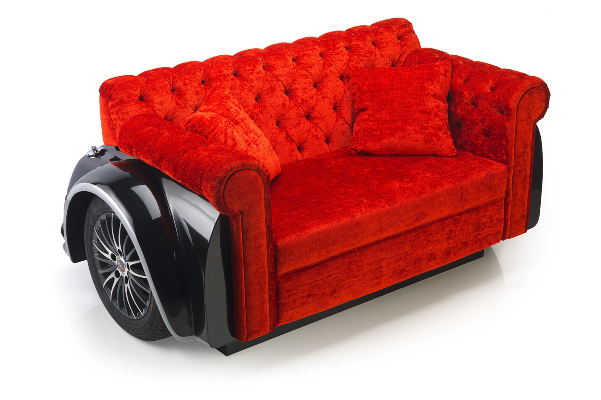 Marylin sofa from a collection Contract from the Italian manufacturer Domingo Salotti. Double club sofa from designers Wanda and Oleg Dadabaev made in the style of pop art in the form of a rear seat of the convertible. The model will adorn a bar, club or cafe. A housing, simulating the rear part of the convertible car is made of metal legs in the form of wheels. Padding models are red velvet, filling - polyurethane foam of different densities. Back and soft rolled arms embellished with stitch Capito. The design is complemented by two small pads. Colors to choose from a collection company.