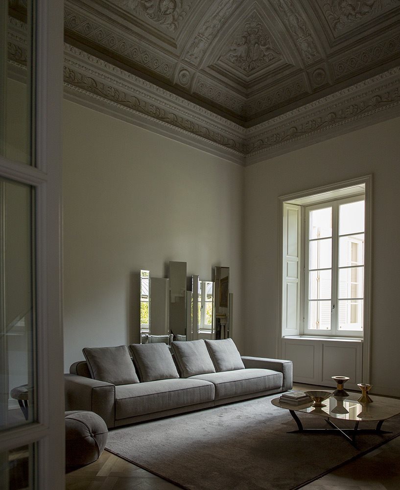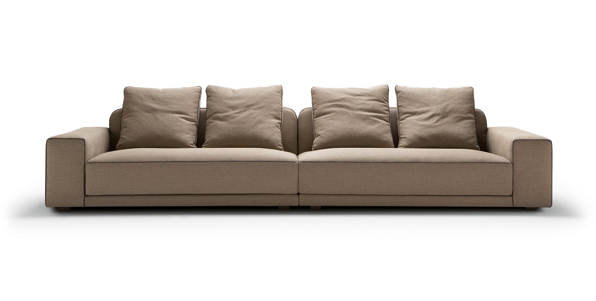 Quadruple sofa Tyron Italian manufacturer Alberta Salotti. The model in a wooden frame in fabric. The model of rectangular form with upholstered armrests. Rectangular cushions are removable. Color suggestion from the manufacturer in a gray tone. A modern solution for living room.
