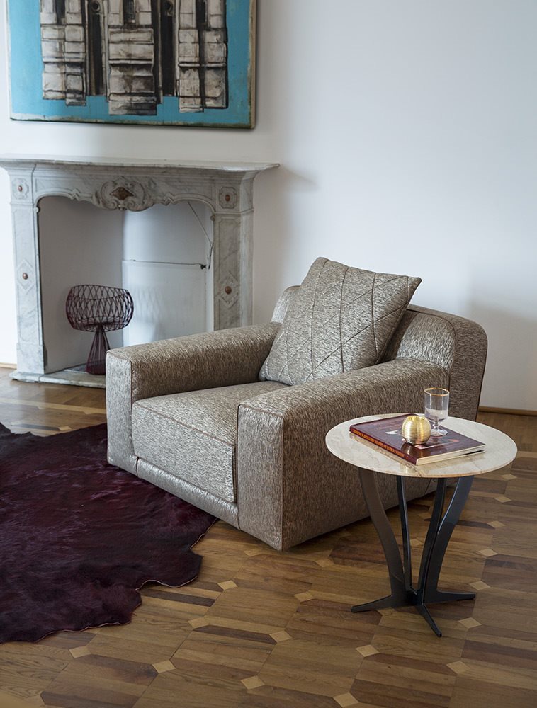 The corner chair Gary Italian manufacturer Alberta Salotti. Presents a model of the square shaped seat with low back. The rectangular armrests, soft. Chair fully upholstered with textile in a gray tone. Perfectly complement the interior living room in modern style.