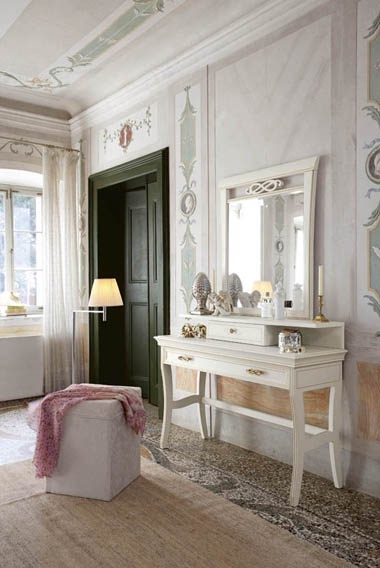 Headsets for bedrooms Vittoria from the Italian manufacturer Alf. The kit consists of beds with high headboard and footboard, equipped with hidden niches, bedside tables, chest with removable top, dressing table, wall mirror and Ottoman in upholstered in textile from a catalog. Frame, the base of the products represented by the solid wood. Finish - lacquer in white color, you can choose from the range. The semi-gloss surface. The refinement of the headset attach the fittings in gilt and carving. Design classic, beautiful choice for a traditional bedroom interior.