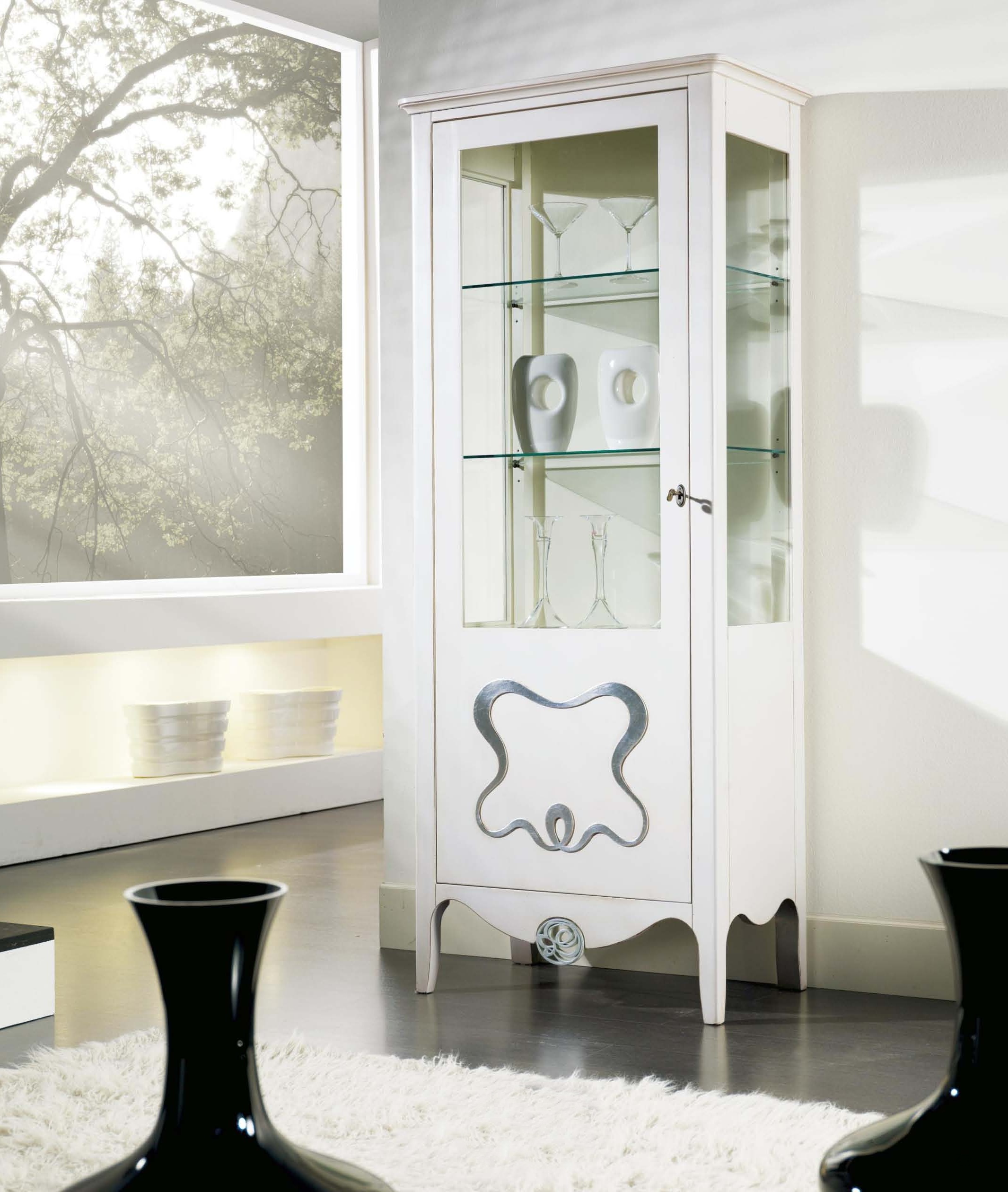 Showcase from Italian manufacturer Mirandola Export. The product is made in a classic style and wooden frame. The model has a door, shelves and sides made of glass. The facade is decorated with a decorative pattern with a silver finish. The perfect showcase Mirandola Export will decorate Your interior.