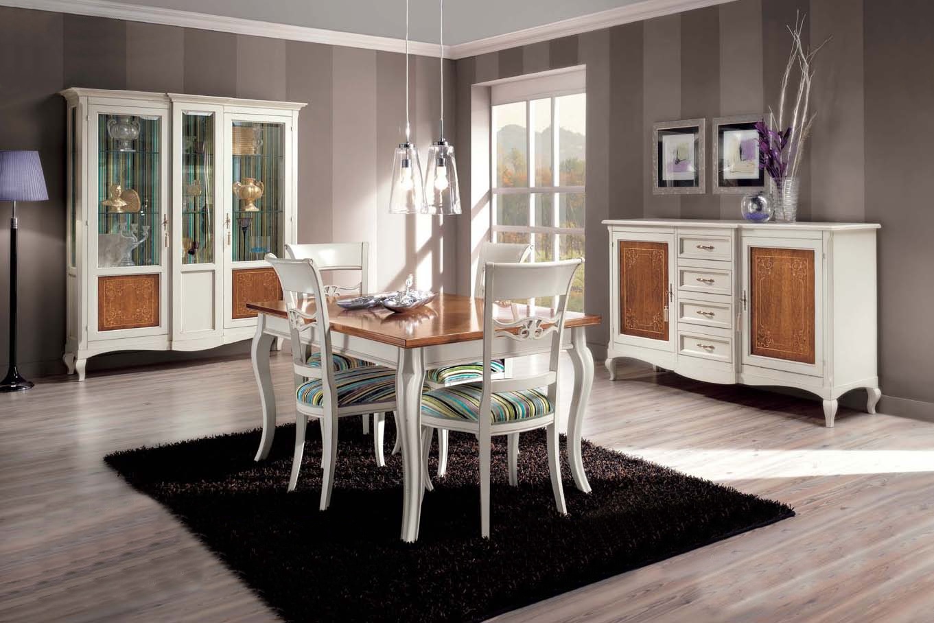 Dining room (dining set) from the Italian manufacturer Mirandola Export. Set is made in a classic style. The frame is wood, upholstery - textiles. Dining room consists of two door showcase, sideboard with drawers, sliding dining table and chairs with upholstered seat. Products inlaid flower carving. Mirandola Export dining room set will create a cozy and comfortable atmosphere in Your dining room.