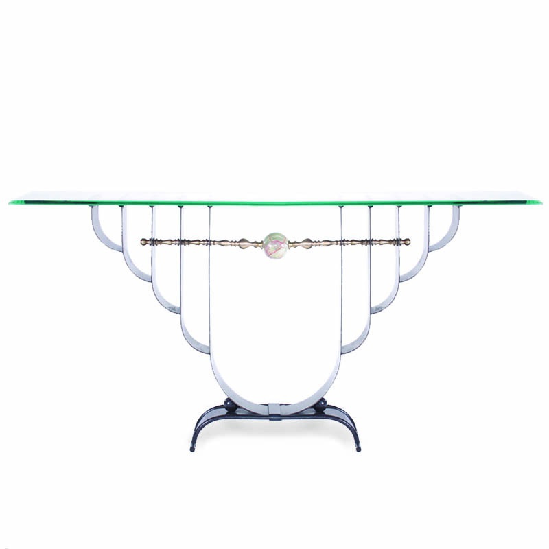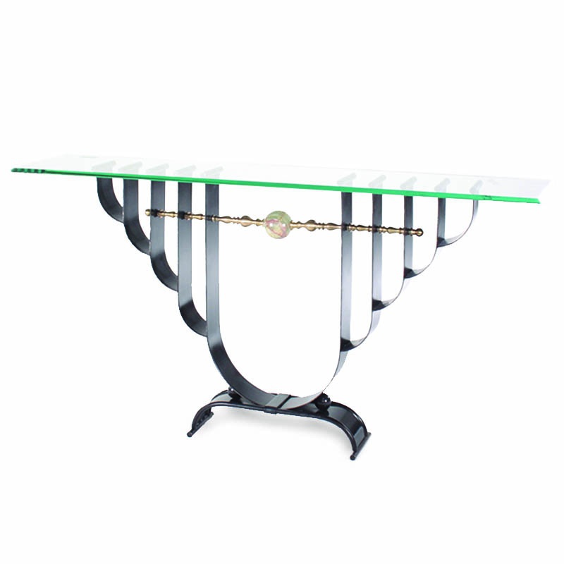 The Delano console from an American manufacturer Bella Luna. Exquisite, elegant console, made in art Deco style, will decorate any interior. Curly frame handmade mounted on a curved iron base with a thickness of 102 mm. table Top made of thick clear glass with beveled edges. The Central part of the console is decorated with items from onyx and brass.