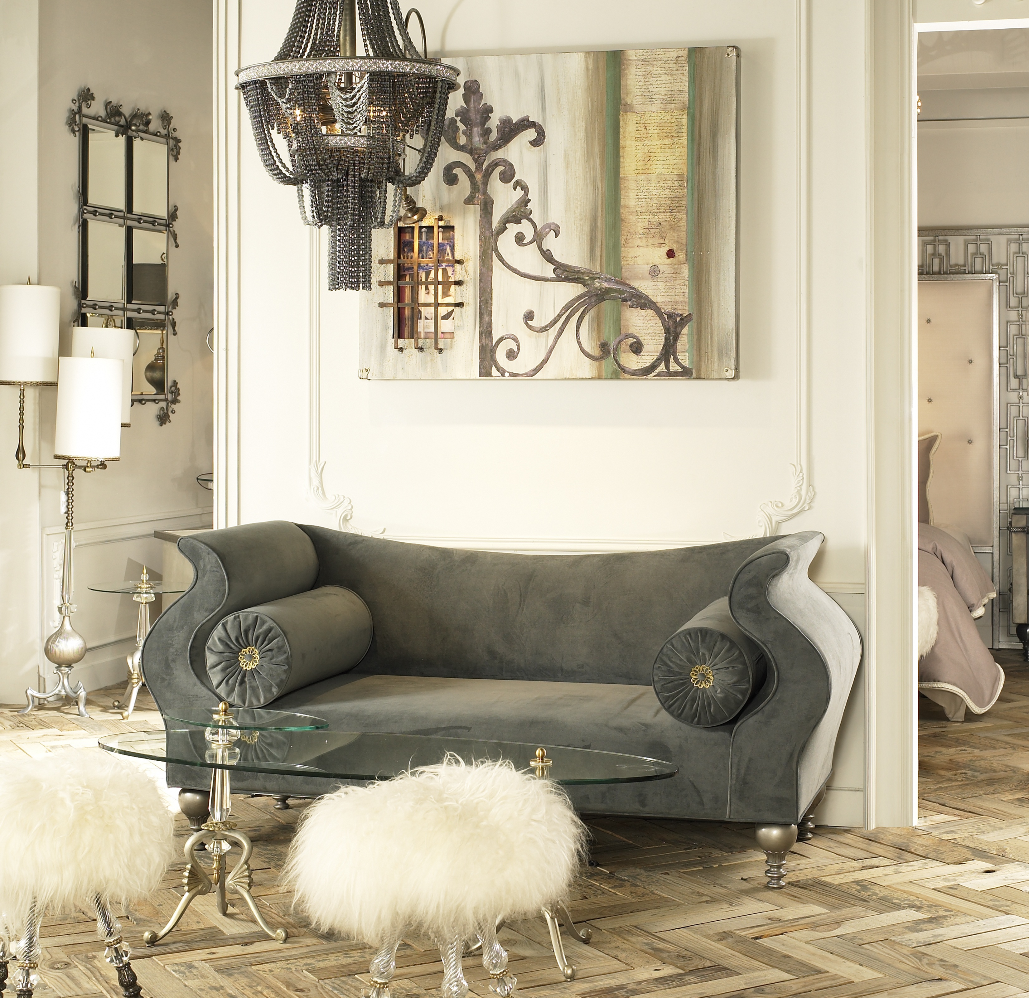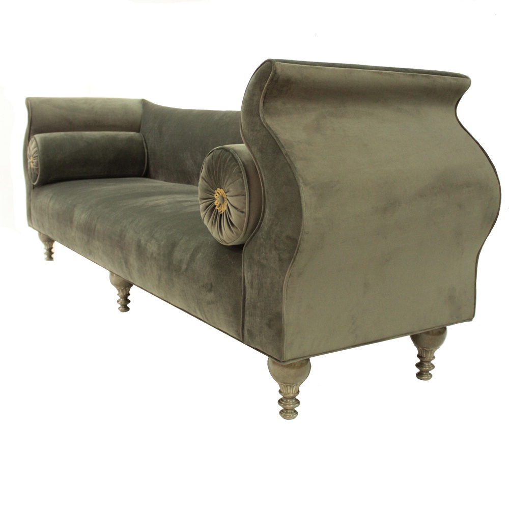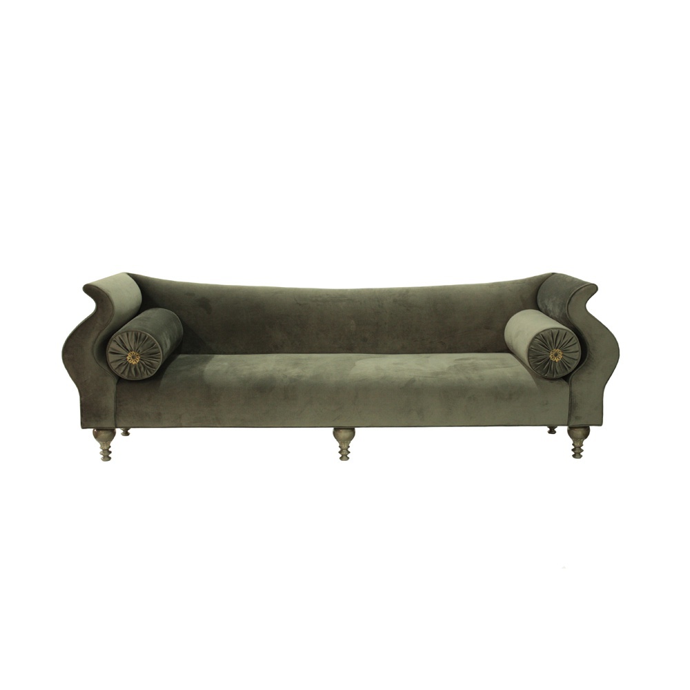 The Dali sofa, from the American manufacturer Bella Luna. Elegant four-seater sofa, designed in art Deco style, will become the focal point of any living room. Wooden frame, metal legs are figured. The backrest and armrests the same height, the sides of the sofa are fantastically twisted and decorated with round thick cushions with elegant finishes of brass. The filler is made of dense foam. Sofa shown in fabric Prima Pewter, available in different colors and textures of textiles from the collection of the company.