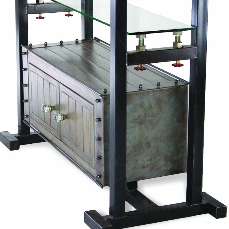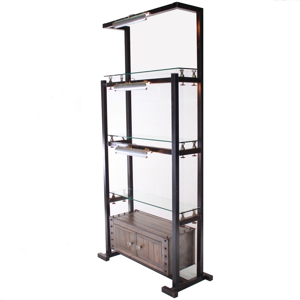 Rack Quint from the American manufacturer Bella Luna. Designer bookcase with open shelves, made in the style hi-tech, organically looks in rooms decorated in a loft style, fusion; will be an original addition to any interior. Base for three-tier rack is a metal frame, to which by means of clamps are attached with three open glass shelves. Shelves are adjustable via metal and brass details, each shelf is provided with lighting. At the bottom is a Cabinet with two swing doors, made of wood and covered with grey stone. The model is distinguished by an abundance of metal parts and the use of fasteners as decoration.