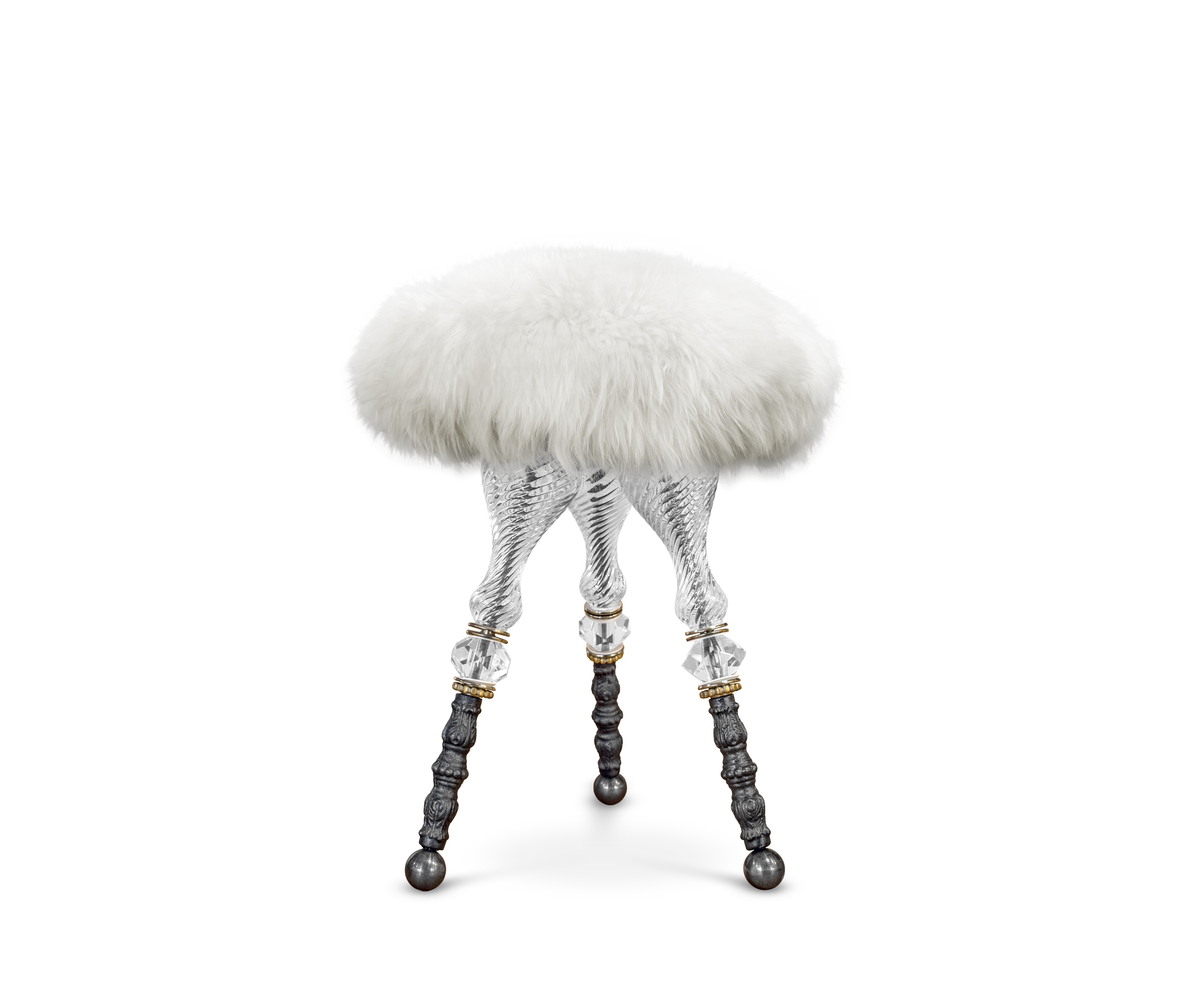Round Ottoman on high legs Cometti from the American manufacturer Bella Luna. A bold design solution combines in this model, two seemingly opposite materials, such as cold metal and warm fur. The frame is made of iron, cast iron legs finished with brass and crystal are dressed in caps that softens the coldness of the metal and harmonizes model. Cast iron painted in a dark pewter tone. Swivel seat is covered in fur of a lamb. The model is shown in a white fur; also the fur Pelt of honey color. All finishing is performed manually.
