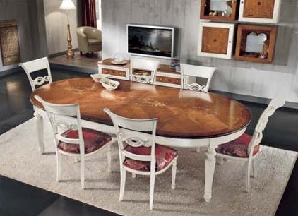 Dining room (dining set) from the Italian manufacturer Mirandola Export. Set is made in classic style and consists of a dining table and chairs. Frame products made of wood, upholstery of chairs and textiles. Sliding round on the table top has inlay Verona. The chairs have a carved back and upholstered seat. Elegant and at the same time gentle Mirandola Export set will adorn Your dining room.