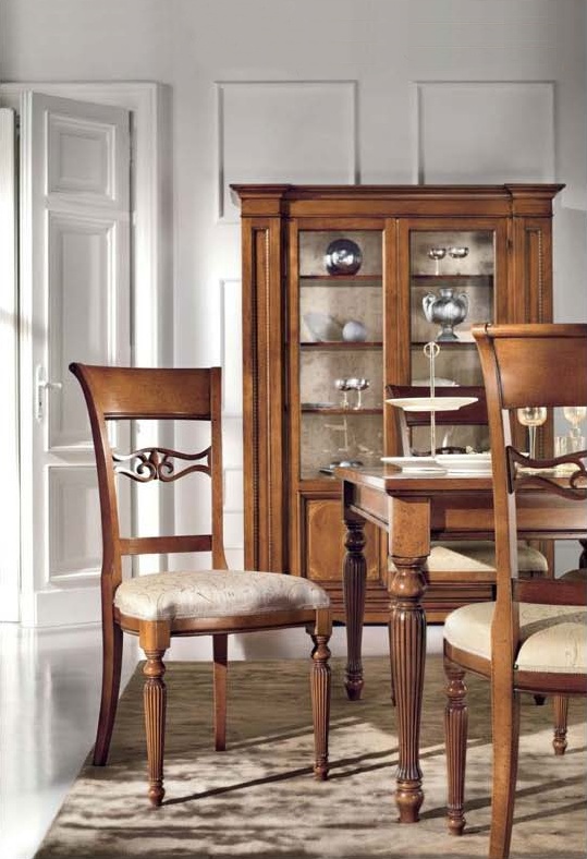 Dining room (dining set) from the Italian manufacturer Mirandola Export. Set consists of a dining extending table with inlaid top and carved legs and chairs with carved back, legs and upholstered seat. Frame products made of wood, upholstery of chairs and textiles. A style classic. Set Mirandola Export perfect choice for Your dining room.