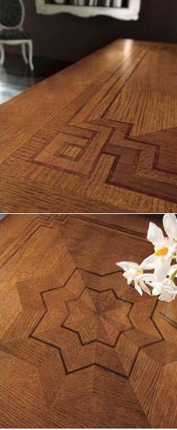Dining room (dining set) from the Italian manufacturer Mirandola Export. The model is executed in classical style. The frame is made of wood, upholstery of chairs and textiles. Set consists of dining table and chairs. The sliding table and decorative pattern. The table top has inlay "star". Soft backrest and comfortable seat make the chairs very comfortable. Perfect set for a classic interior.