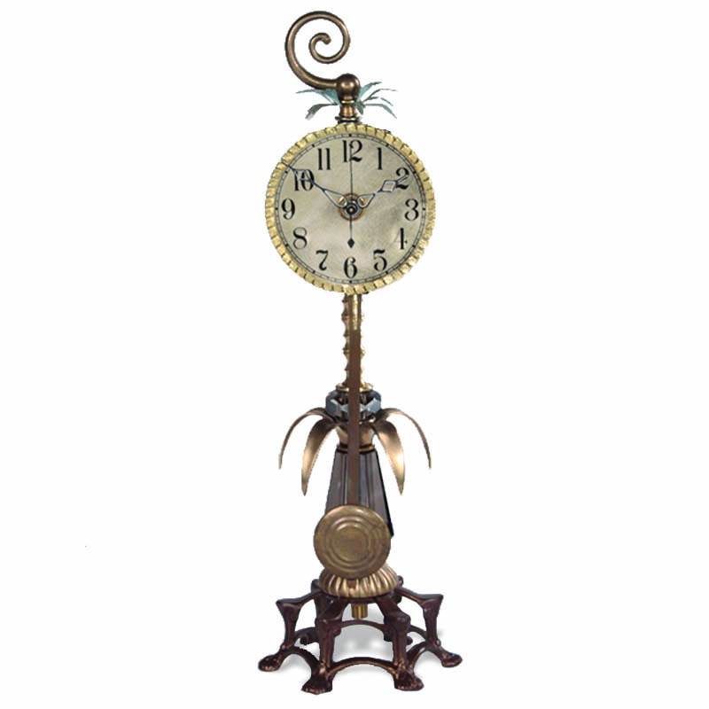 Watch interior Pili from the American manufacturer Bella Luna. Small table clock with a pendulum made of wrought iron and brass in an art Deco style. Round white dial with Arabic numerals and gold bezel, hands laced. Frame and versatile stand is decorated with brass and crystal details. Quartz mechanism, AA batteries. Elegant watch will become not only a functional addition to the interior, but will give it a unique charm.