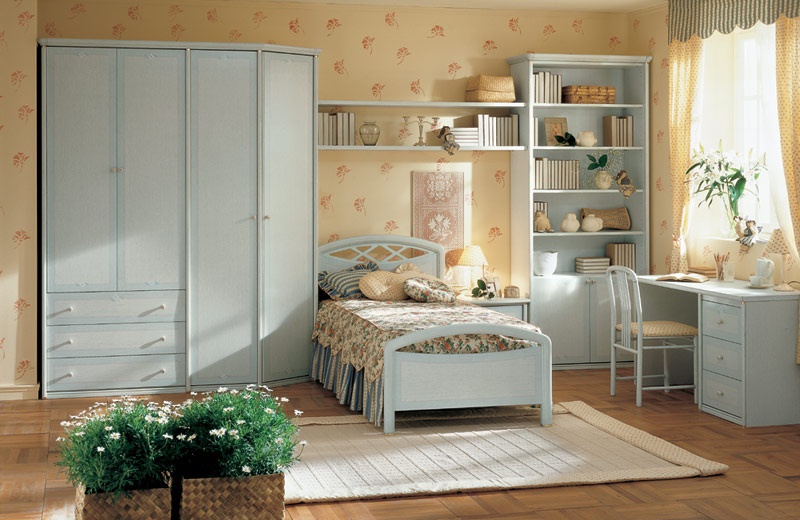 Set for children's C29 from the Italian producer Julia Arredamenti. Includes single bed, wardrobe, shelves, Desk and chair. The frames are made of wood. Accessories metal. The surface is covered with varnish.