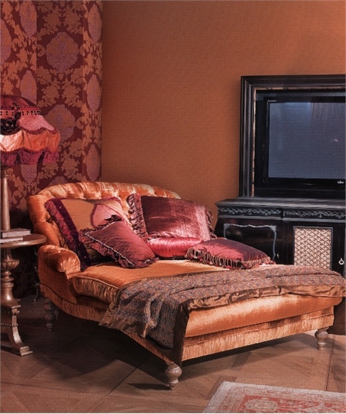 Elizabeth couch from the Italian manufacturer Provasi. The body and legs of the couch are made of solid wood and the upholstery is made from silk. The color of this model of couch - orange.