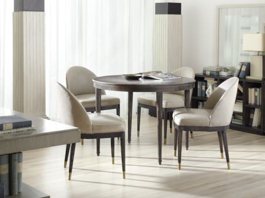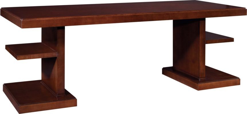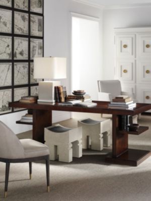 The Dalton Desk from the Suzanne Kasler collection from the American manufacturer Hickory Chair. The model has an elegant geometric design and practical comfort. Made of wood. Long top, cantilever legs with two shelves for books on wide supports. Standard finish - light walnut veneer; also available in the model in the trim dark walnut and the color of Weathered Stone.