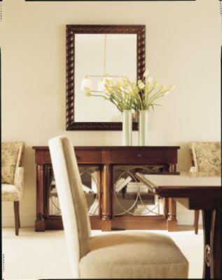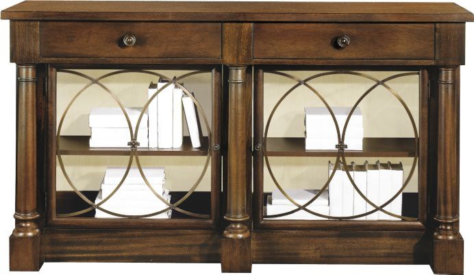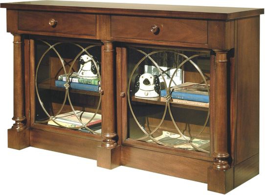 The buffet Server of credenza from the collection of world-famous designer Mariette Himes Gomes from the American manufacturer Hickory Chair. The collection features a stylish combination of classic and modern high quality materials, the unity of details and finishes. Low sideboard designed in the classical style. Two hinged glazed doors, ornate antique bronze, with adjustable shelves, two pull-out drawer, one of which is provided with a tray for silverware. The front is decorated with carved stand in the form of columns. Standard finish is dark walnut; the model is available in dozens of finishes, including additional coverage of Oxford.