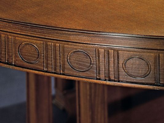 The Arden dining table from the Suzanne Kasler collection from the American manufacturer Hickory Chair. The model is characterised by its elegant design and practical comfort, it will become the natural centre of the dining room or living room. Made of hardwood. Massive sculptural base with columns and shaped base. Round table top has a distinctive carved border with a geometric pattern of circles and vertical lines. Standard finish is dark walnut; the table is also available in milky white color, as well as in the brushed finish with gold plating.