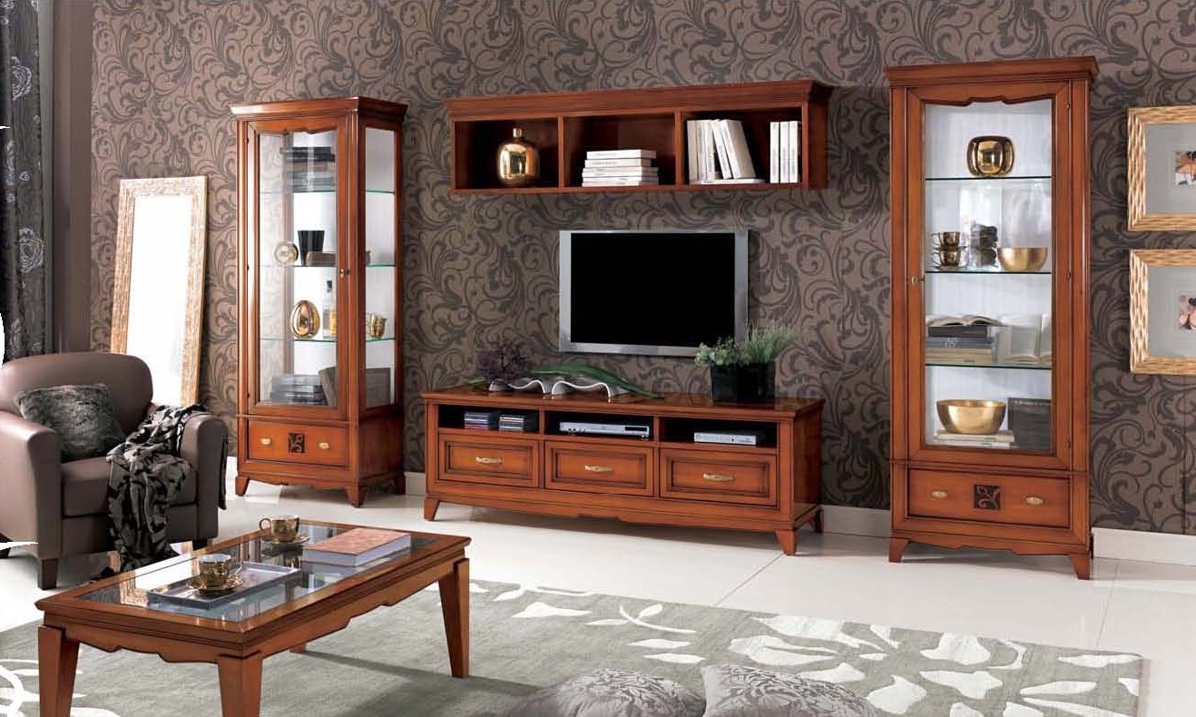 Living room (sofa set) from the Italian manufacturer Mirandola Export. Set is made in a classic style. The frame is made of wood, walnut finish. Set consists of coffee table with glass top and modular system that has two display cases with drawers, Cabinet for TV and a shelf for books. Versatile and roomy Mirandola Export set will add elegance to Your interior.