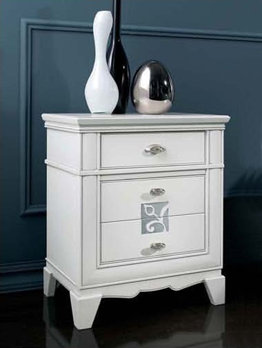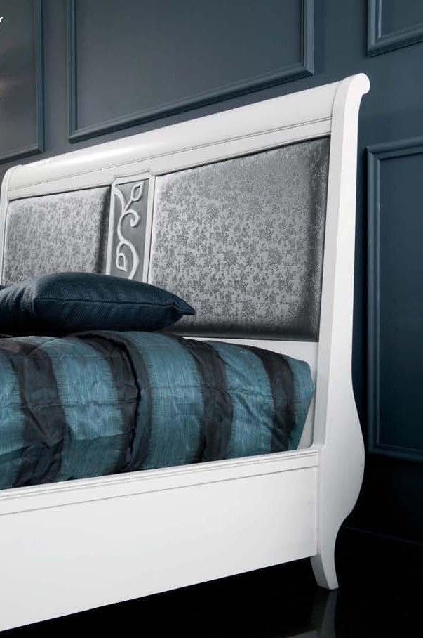 Bedroom (Suite bedroom) from the Italian manufacturer Mirandola Export. Products are made in the classic style. The frame is wood, upholstery - textiles. Set consists of a double bed with high upholstered headboard and bedside tables with three drawers and decorative handles. Model decorated with a pattern of silver sheet. Elegant and graceful Mirandola Export set will adorn Your bedroom.