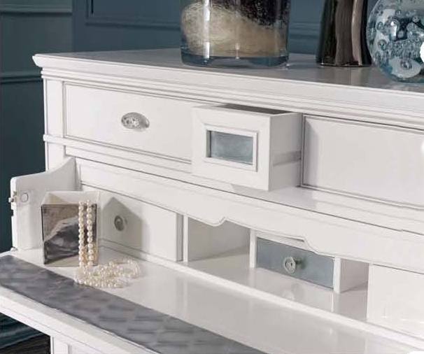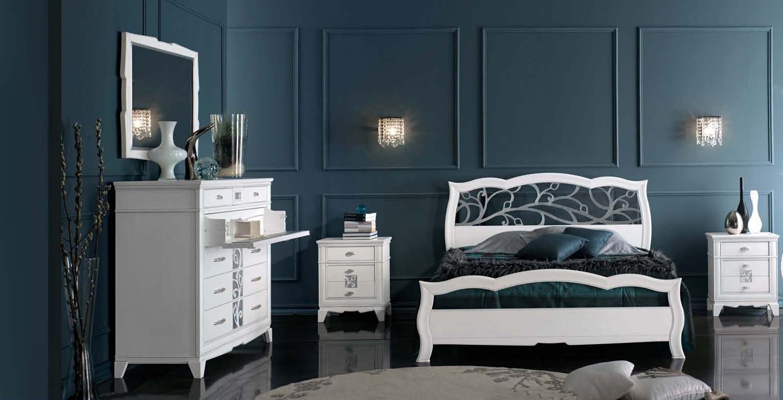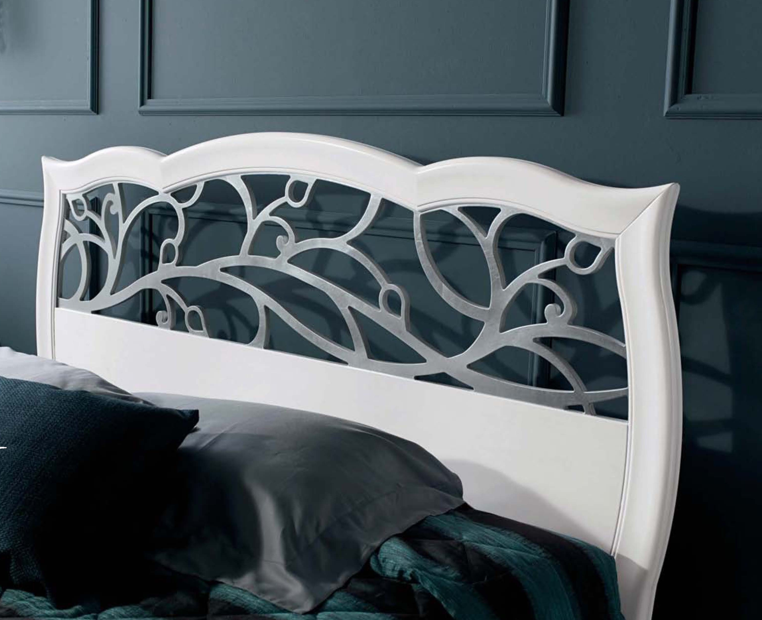 Bedroom (Suite bedroom) from the Italian manufacturer Mirandola Export. Set includes double bed, chest of drawers and bedside tables. The bed has a high carved headboard and can have different sizes. Bedside tables with three drawers. The dresser has five drawers. Products are embellished with silver leaf. Beautiful set of Mirandola Export will create a pleasant holiday atmosphere.