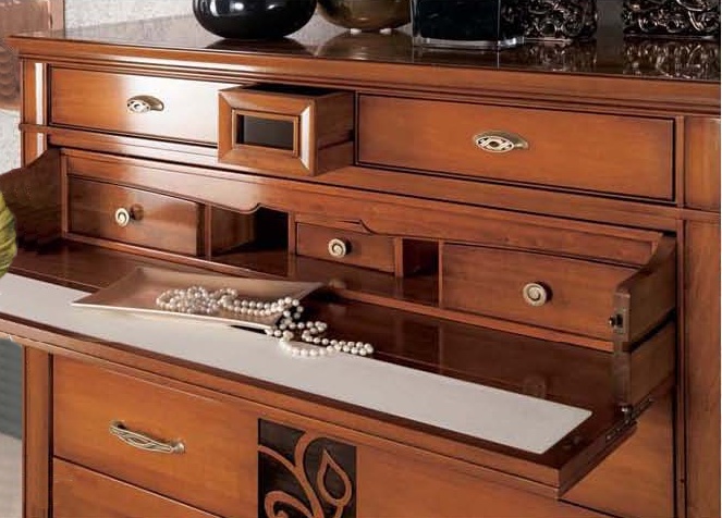 A chest of drawers pattern from the Italian manufacturer Mirandola Export. The dresser has five drawers one of which is provided with a push-pull and inside has compartments and small drawers. Model in classic style made of wood and finished in walnut. Multifunctional and elegant dresser Mirandola Export will easily complement Your interior.