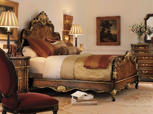 Double bed from the Arabesque collection from the American manufacturer Henredon. Luxury bed in neo-Baroque style decorated with filigree hand carved. Made from hardwood finish from the root of the chestnut and pecan veneers. Frame, legs, headboard and footboard are decorated with carvings and gold patina. Shaped high headboard crowned with carved phial in the form of arms. The kit includes support spring box and mattress; foot height 970 mm.
