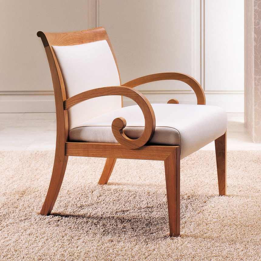 Doris a chair from the Italian manufacturer Porado. Chair with twisted arms on a frame of solid cherry. Soft back and seat upholstered in fabrics or leather from the company portfolio. Available upholstered in fabric customer.