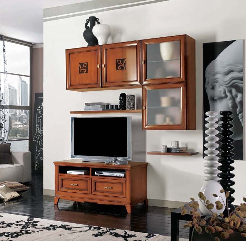 Modular system from Italian manufacturer Mirandola Export. Compact modular system is made in a classic style. The frame is made of wood and finished in walnut. The system has a Cabinet for your TV with two open compartments and two drawers, open shelves and suspended cabinets with doors of frosted glass. Modular system Mirandola Export will give Your living room warmth and elegance.